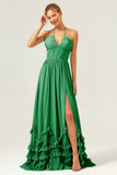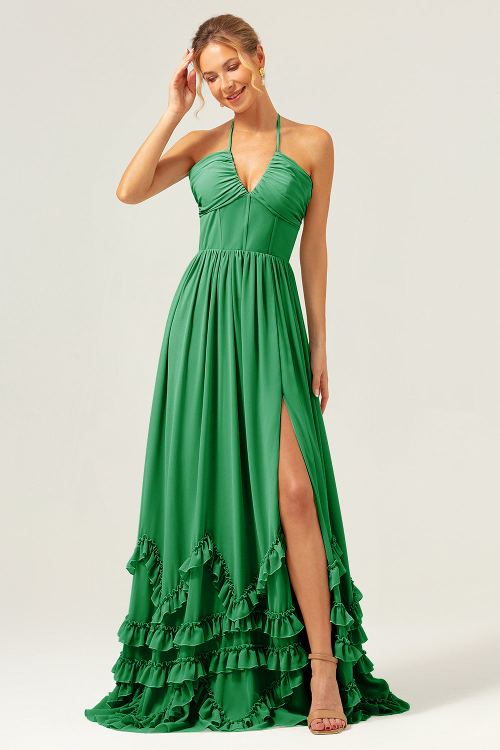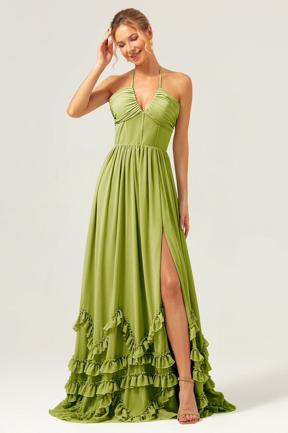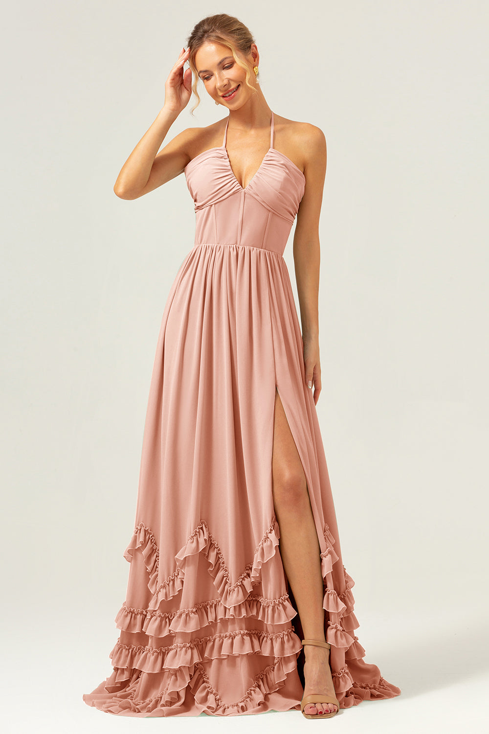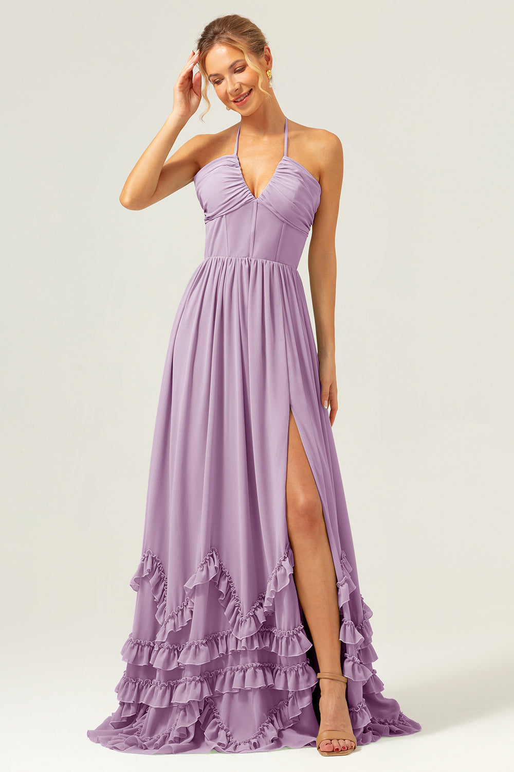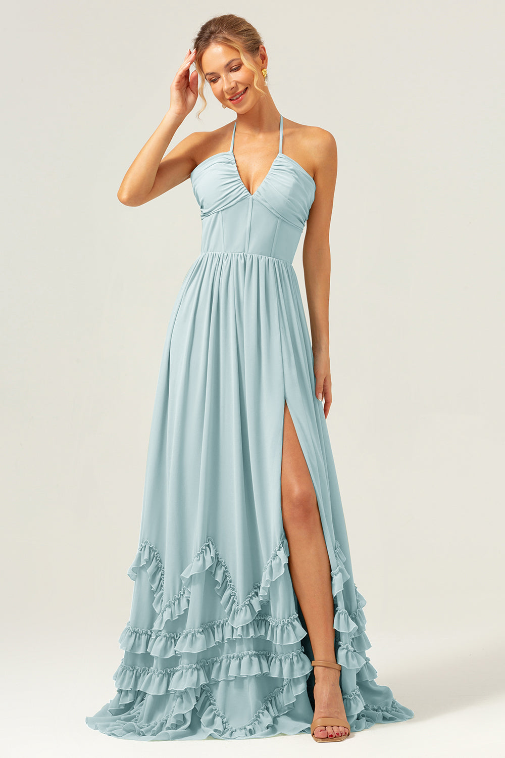 A Line Halter Lace Up Back Chiffon Long Bridesmaid Dress with Slit
