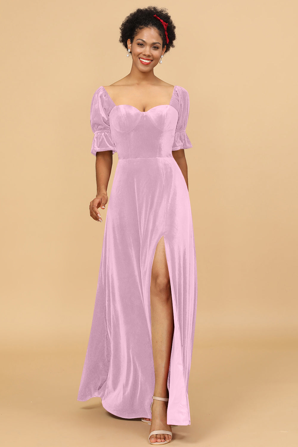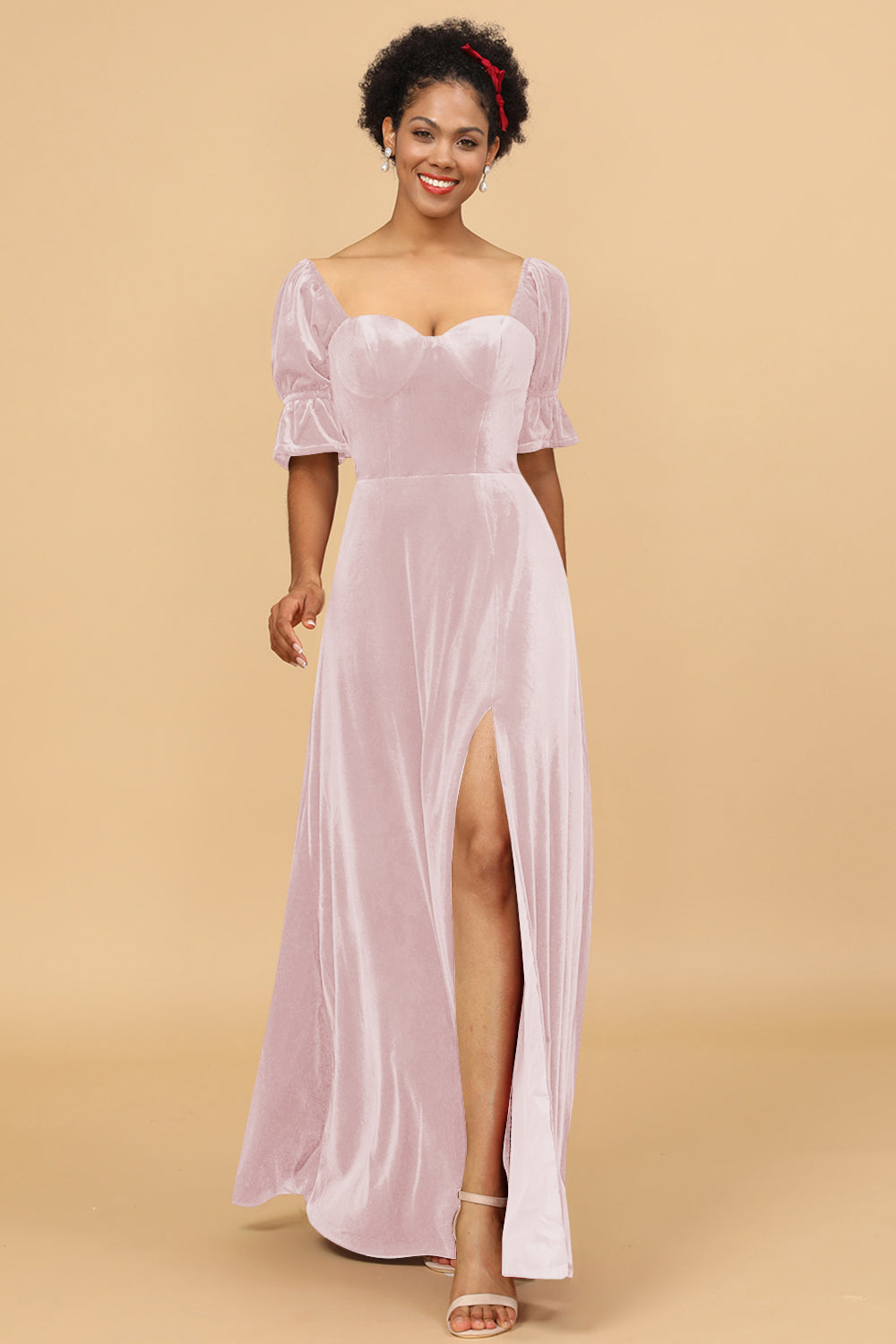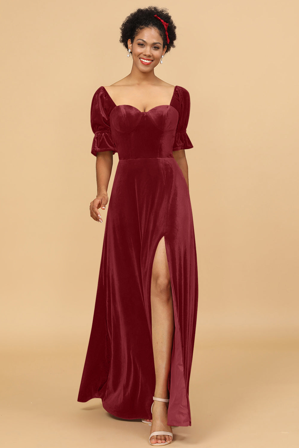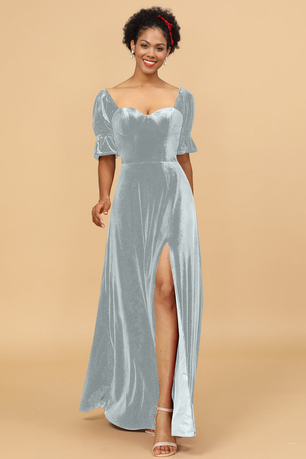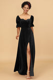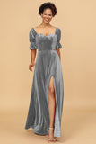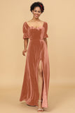 A Line Sweetheart Flare Sleeves Velvet Bridesmaid Dress with Slit