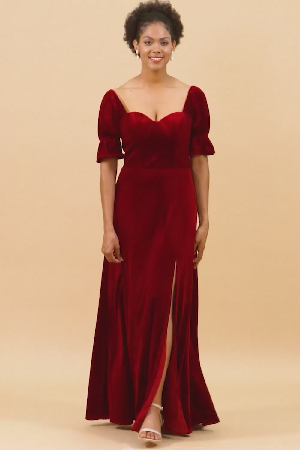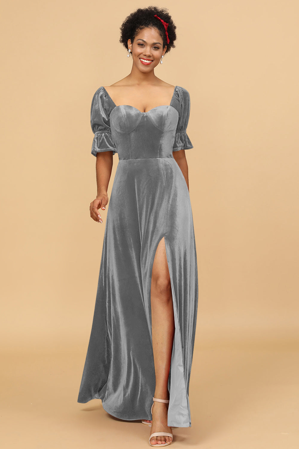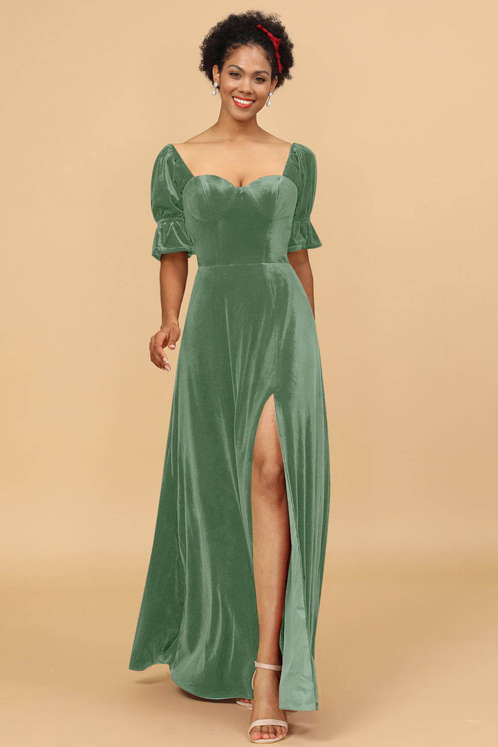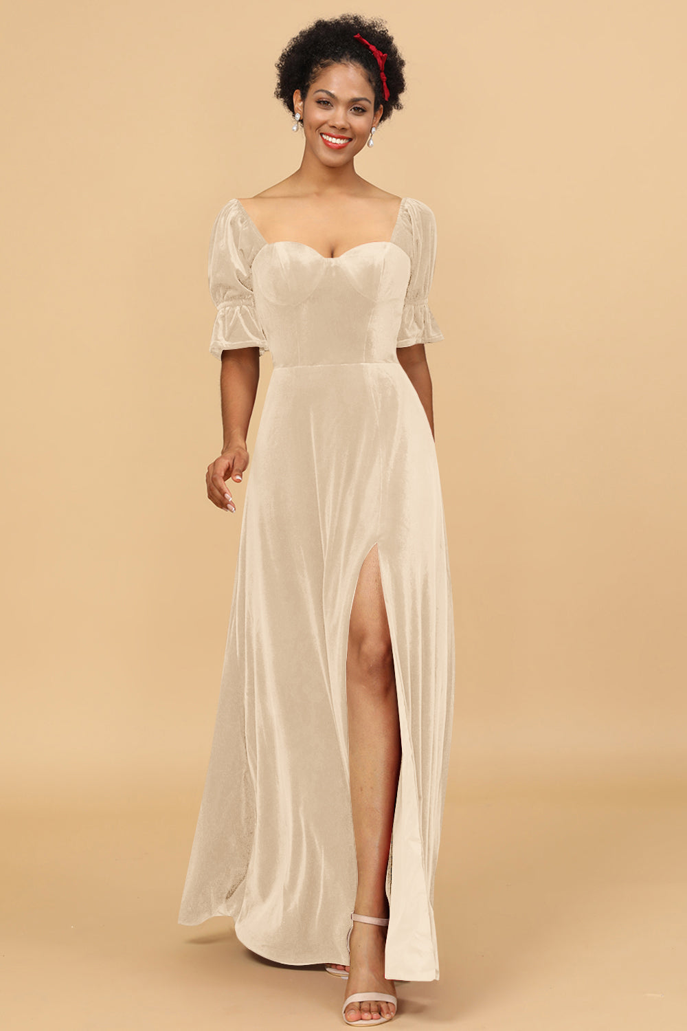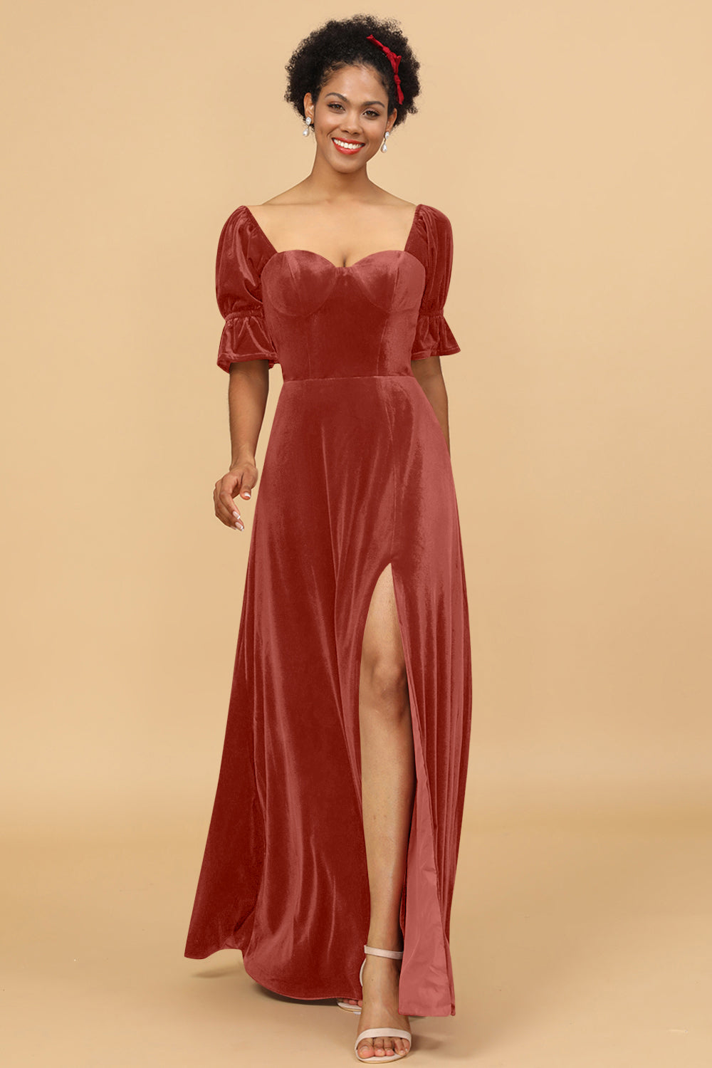 A Line Sweetheart Flare Sleeves Velvet Bridesmaid Dress with Slit