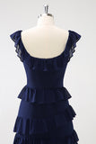 Dark Navy A Line Square Neck Tiered Long Chiffon Bridesmaid Dress with Ruffles