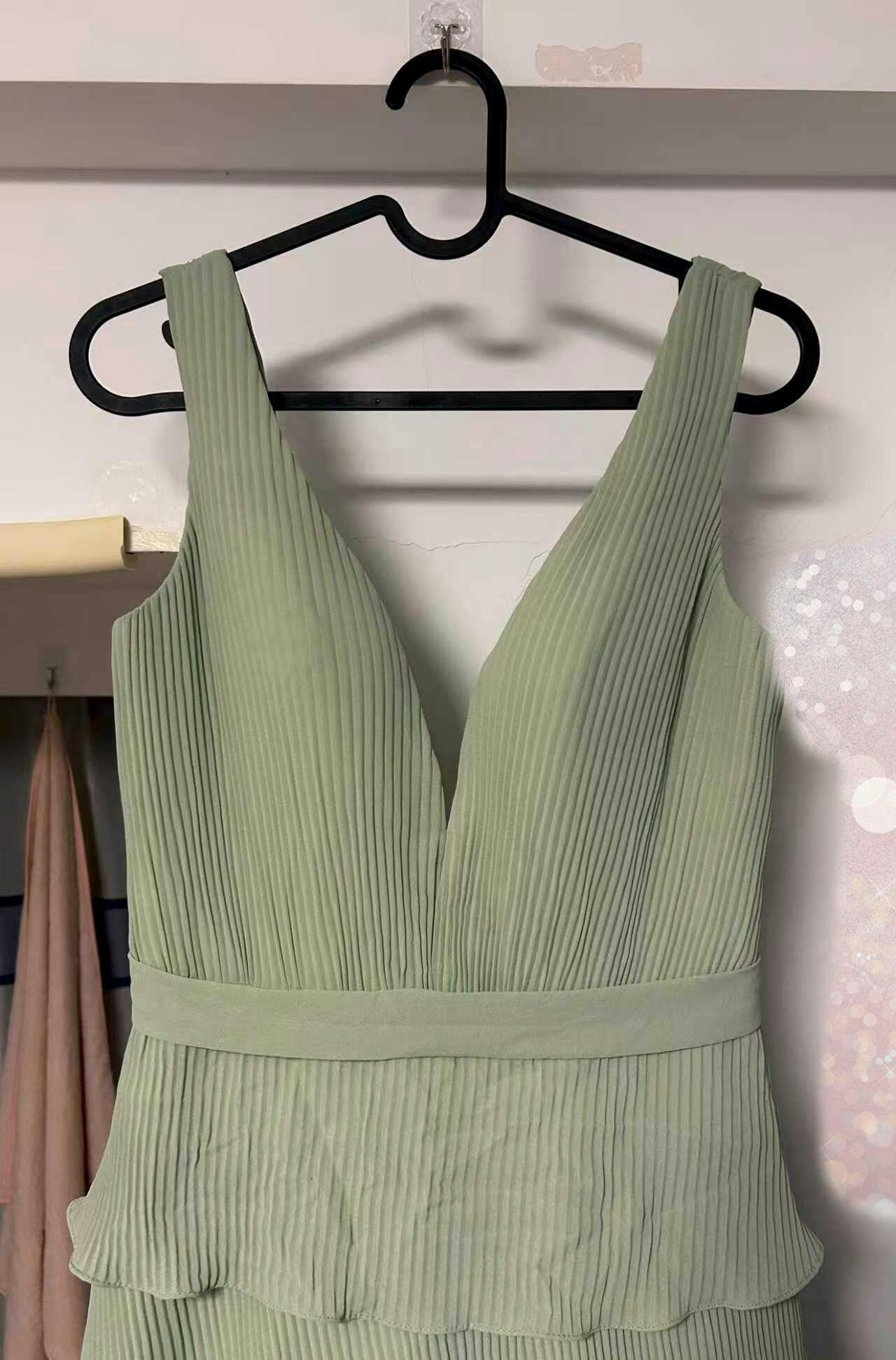 Dusty Sage A Line V-Neck Pleated Tiered Open Back Long Bridesmaid Dress with Slit