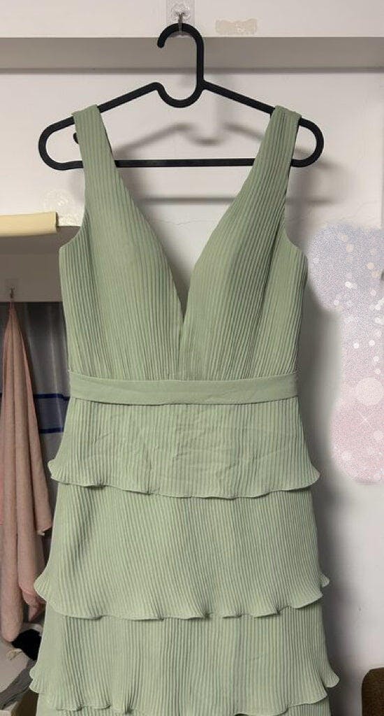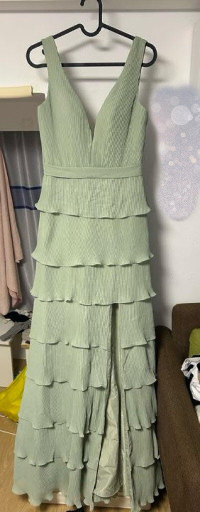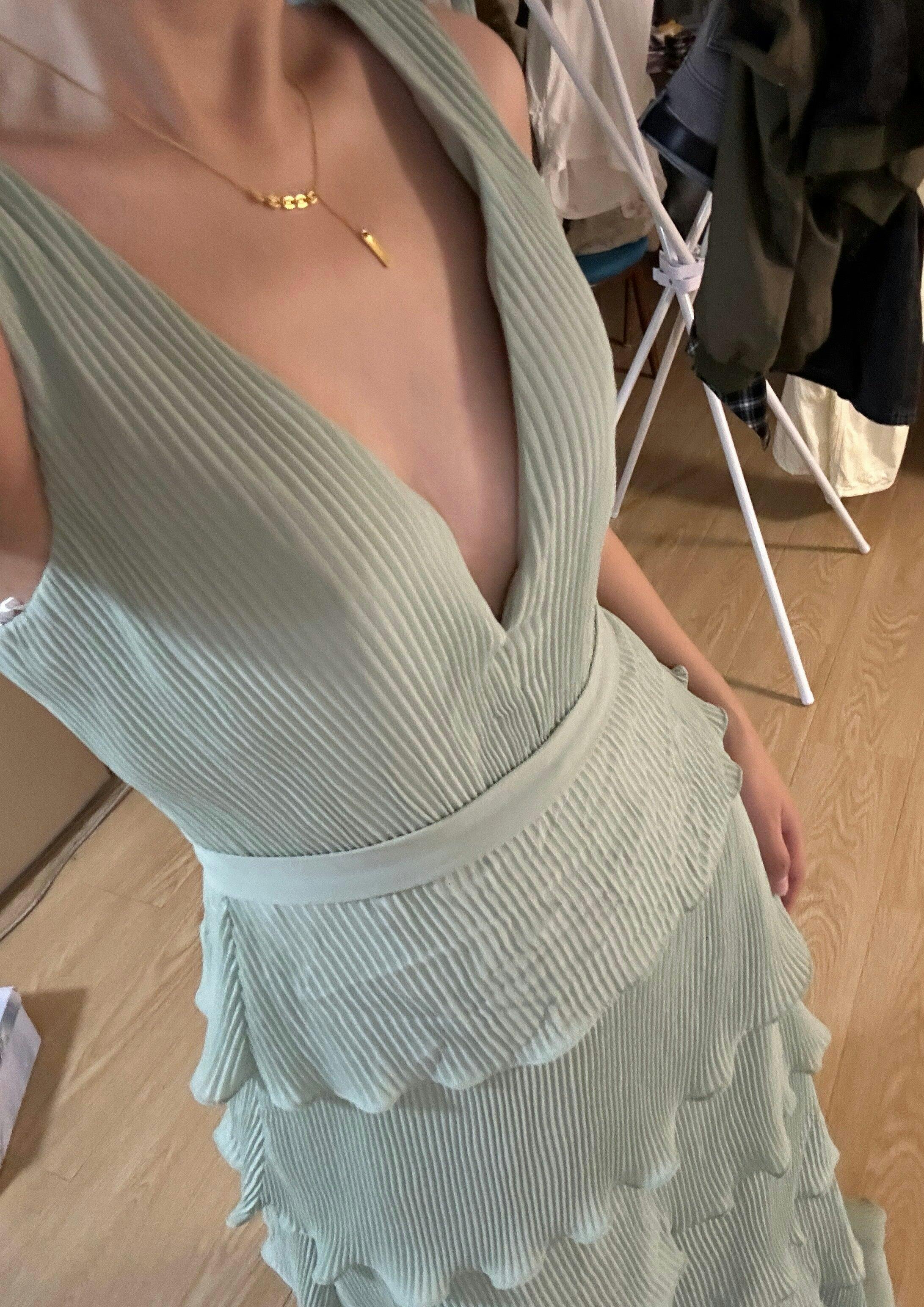 This dress is an ethereal vision of elegance, featuring delicately pleated fabric that cascades into layered ruffles for a flowing, graceful effect. The deep V-neckline and fitted bodice create a flattering silhouette, while the cinched waist enhances the feminine shape. The tiered pleated skirt adds depth and movement, making this gown a stunning choice for any formal occasion.