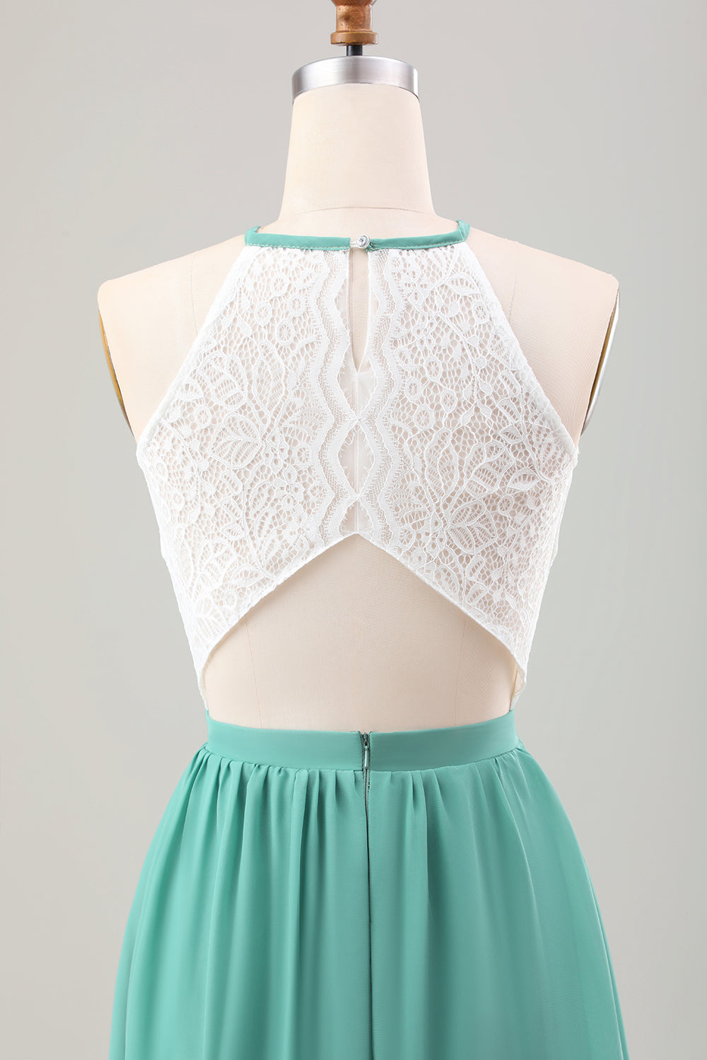 Eucalyptus A-Line Halter Tiered Chiffon Long Bridesmaid Dress With Lace