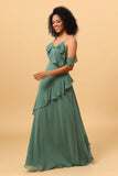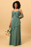 Eucalyptus Spaghetti Straps Long Chiffon Bridesmaid Dress with Ruffles