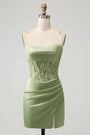 Sage Green Mermaid Sparkly Sequin Pleated Corset Satin Prom Dress