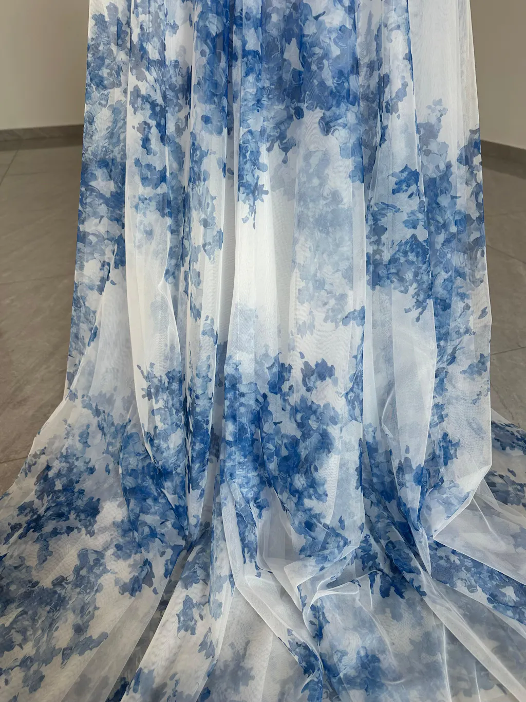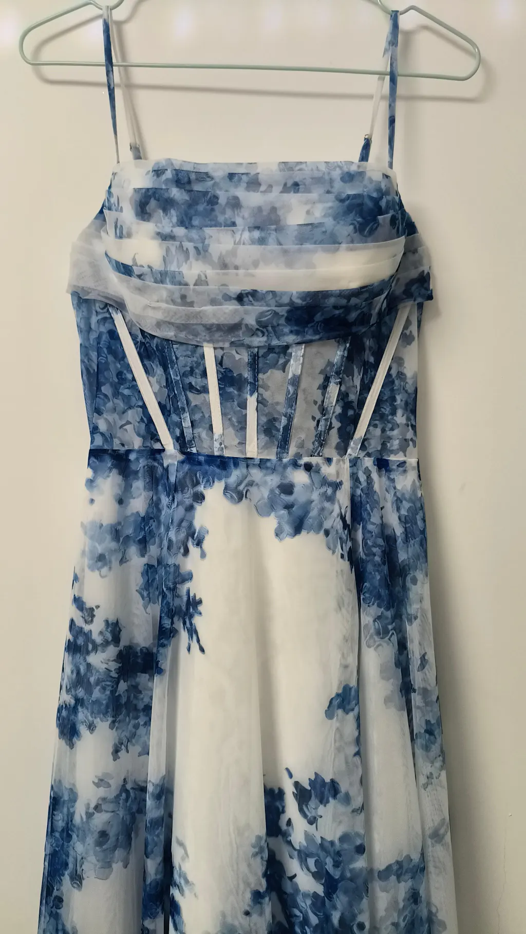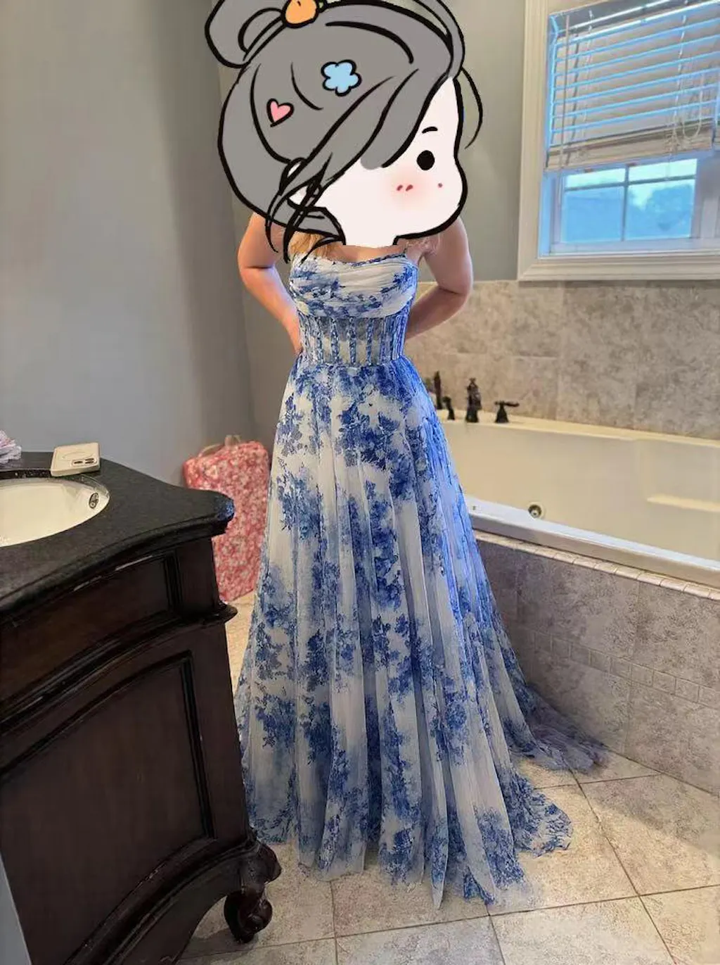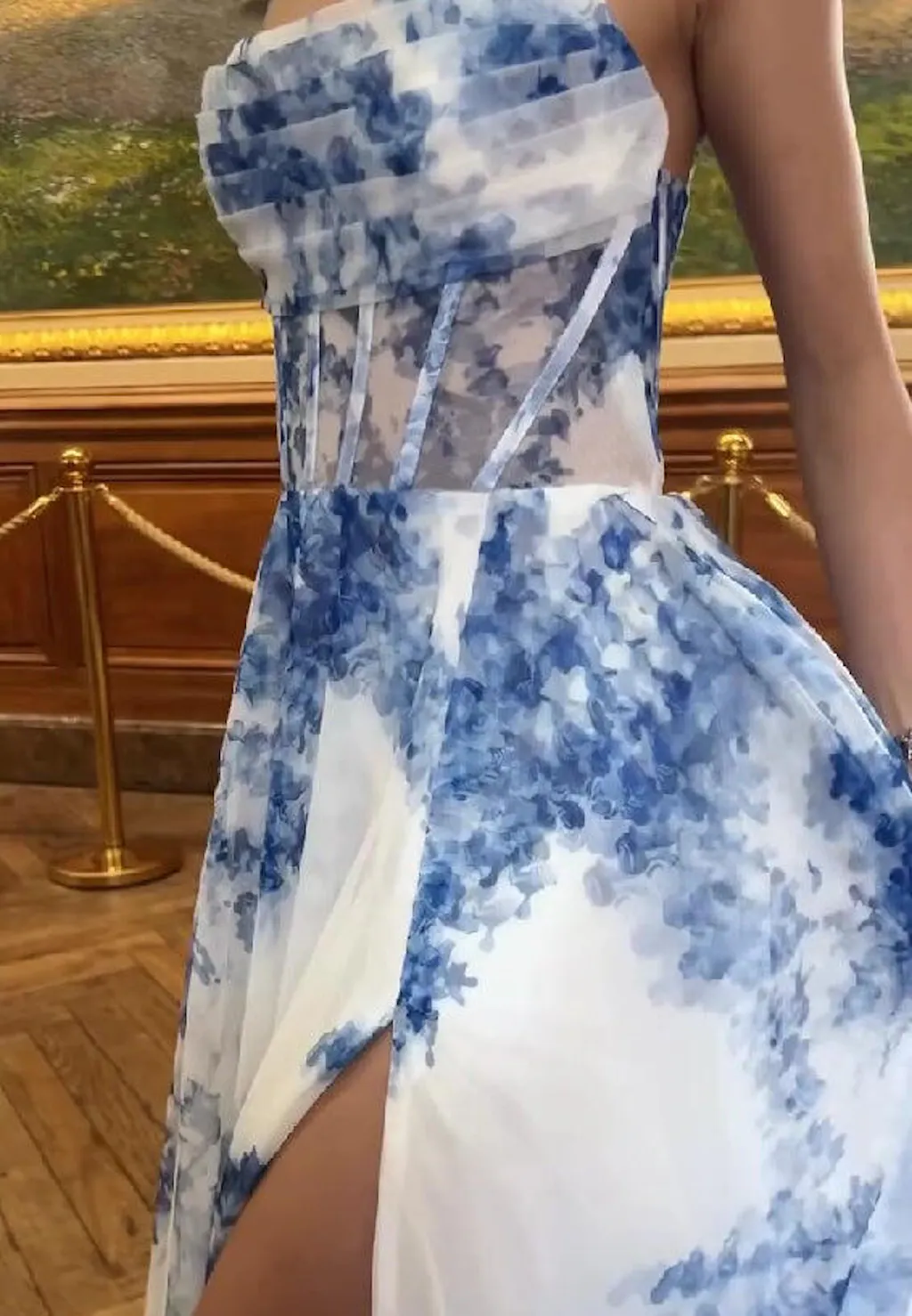 White Blue Flower A-Line Spaghetti Straps Corset Long Prom Dress With Slit