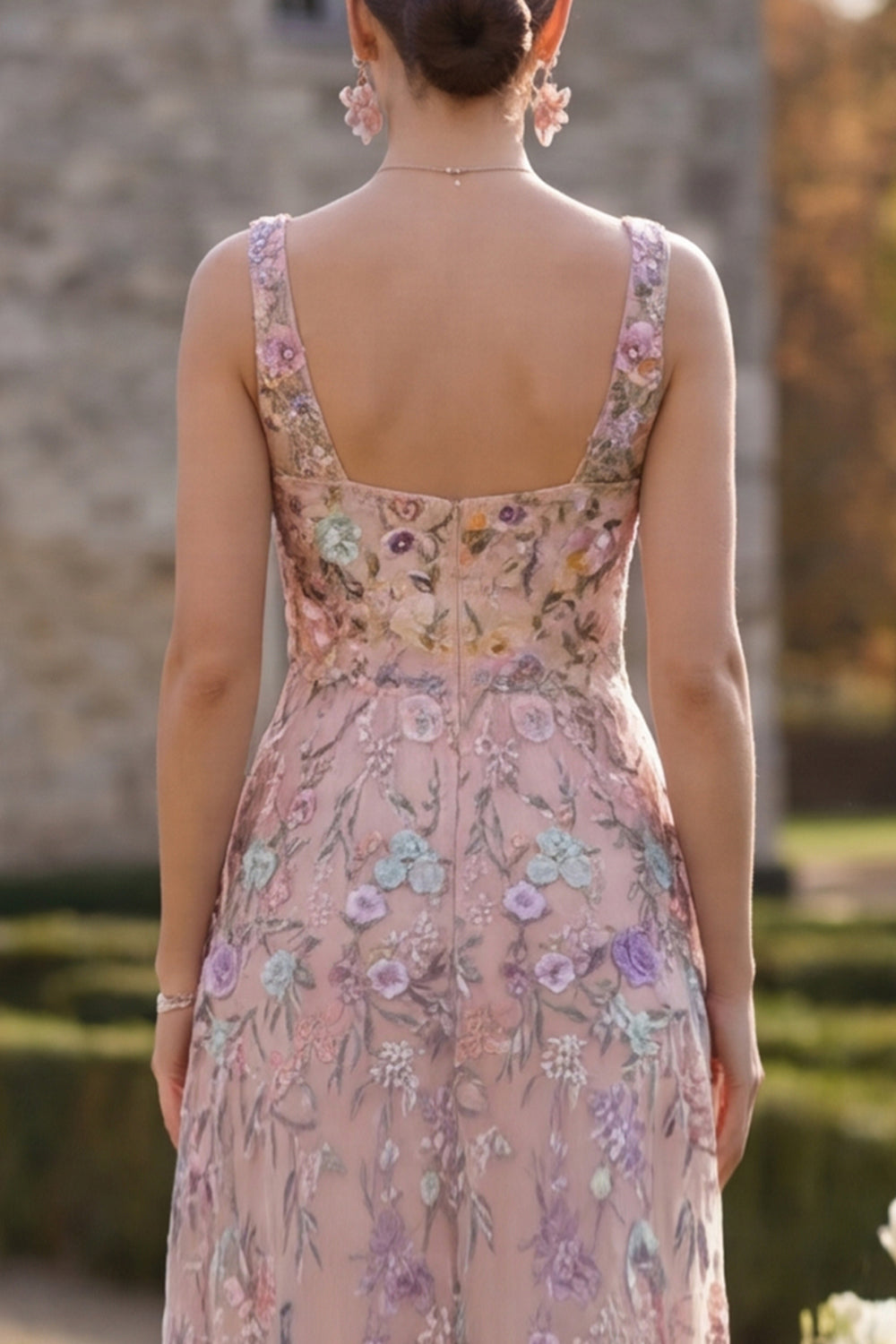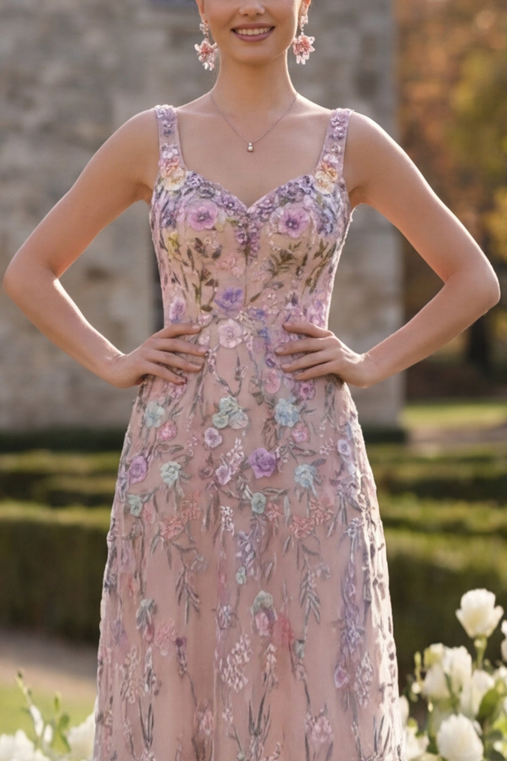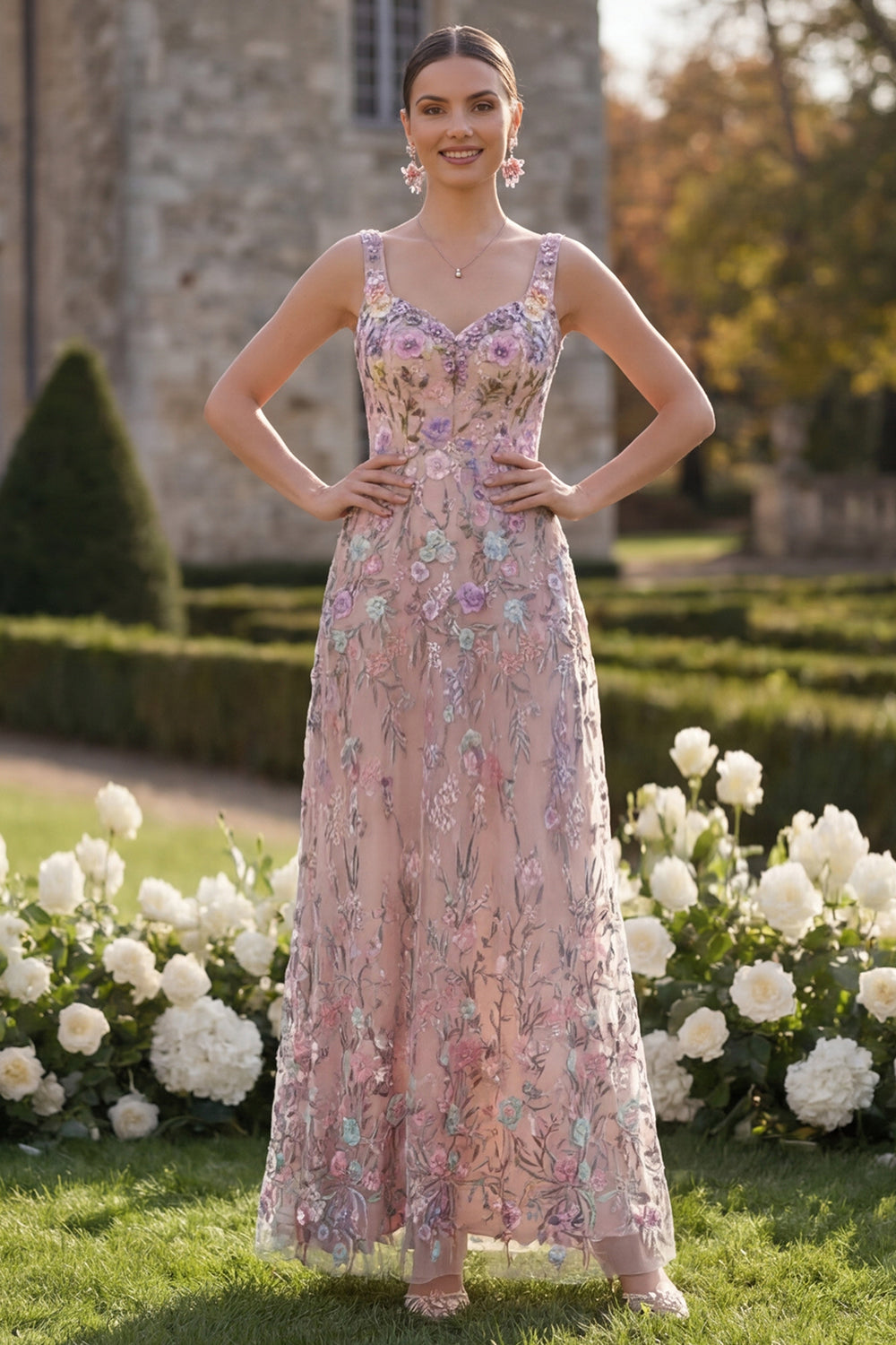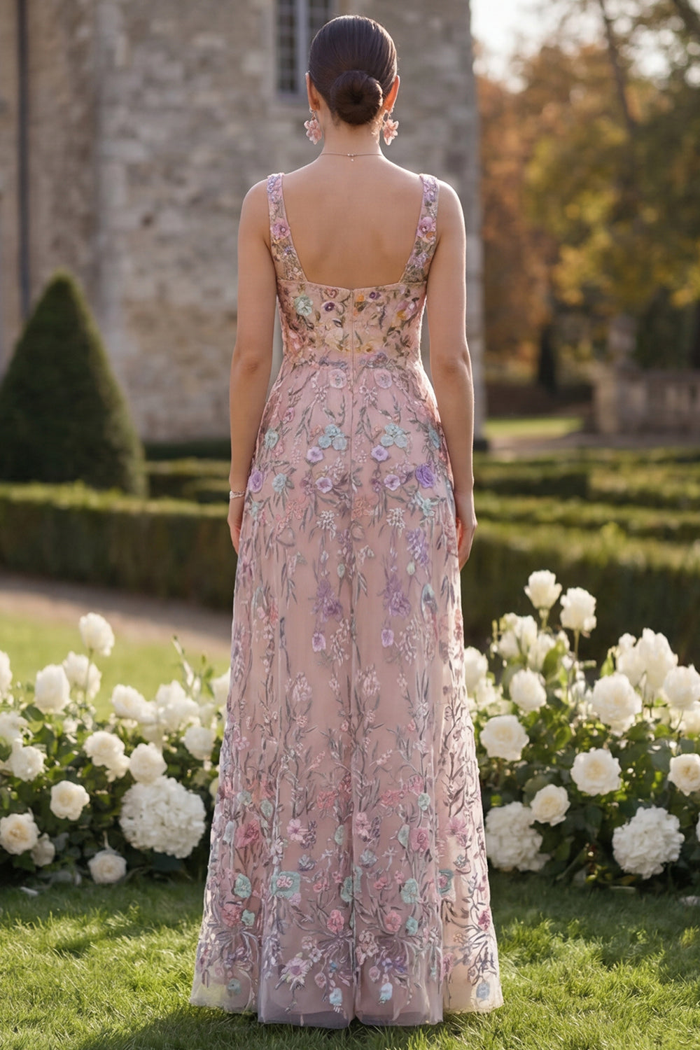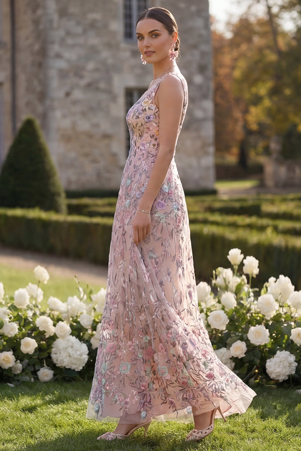 Blush Flower Appliqued A Line Long Wedding Guest Dress