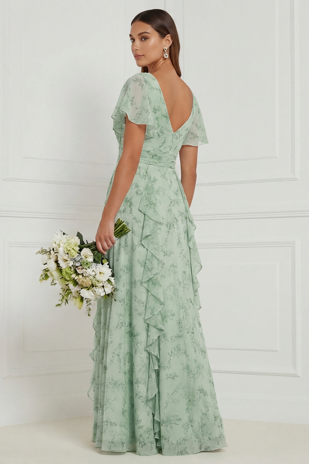 Dusty Sage A Line V Neck Ruffled Long Bridesmaid Dress with Short Sleeves