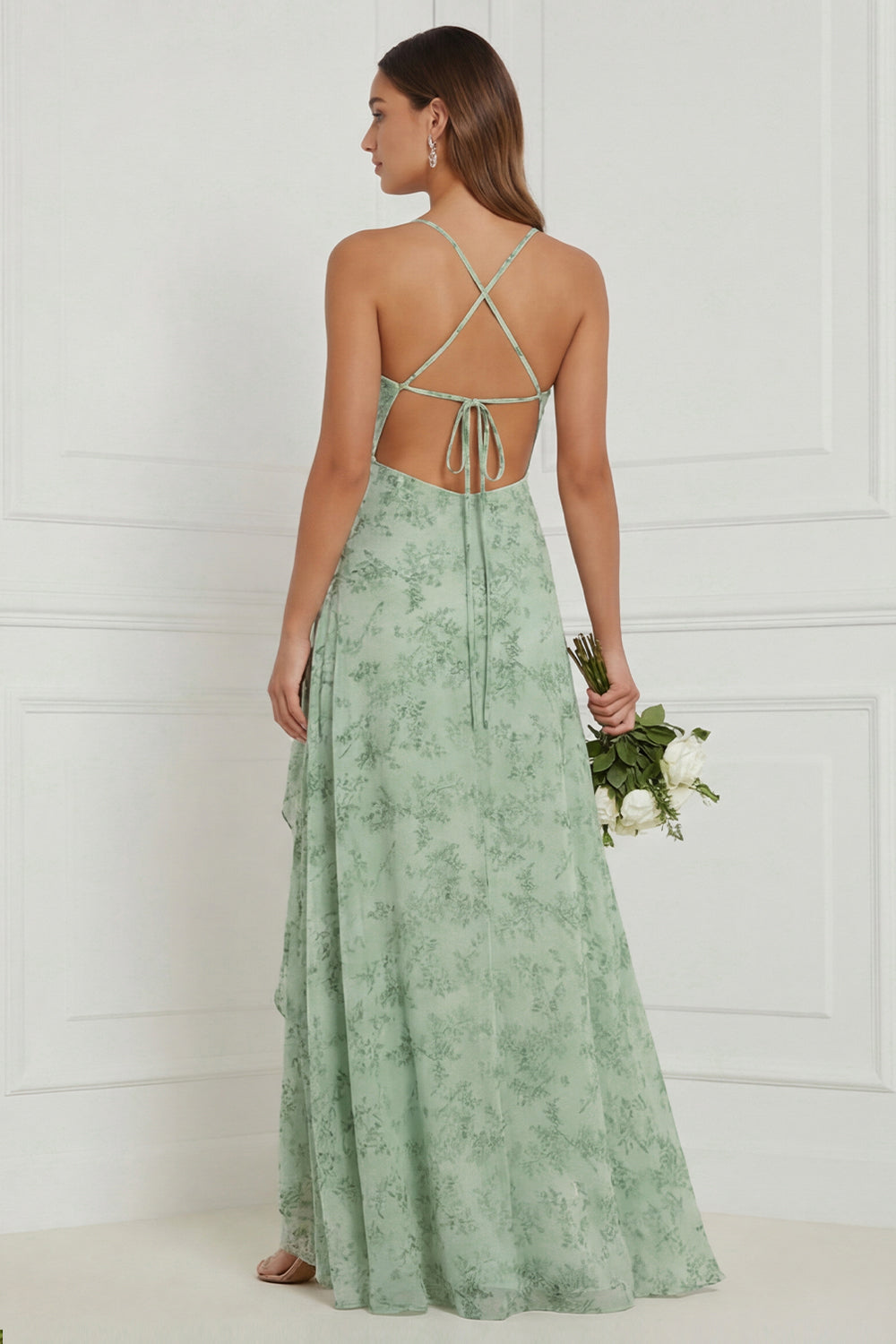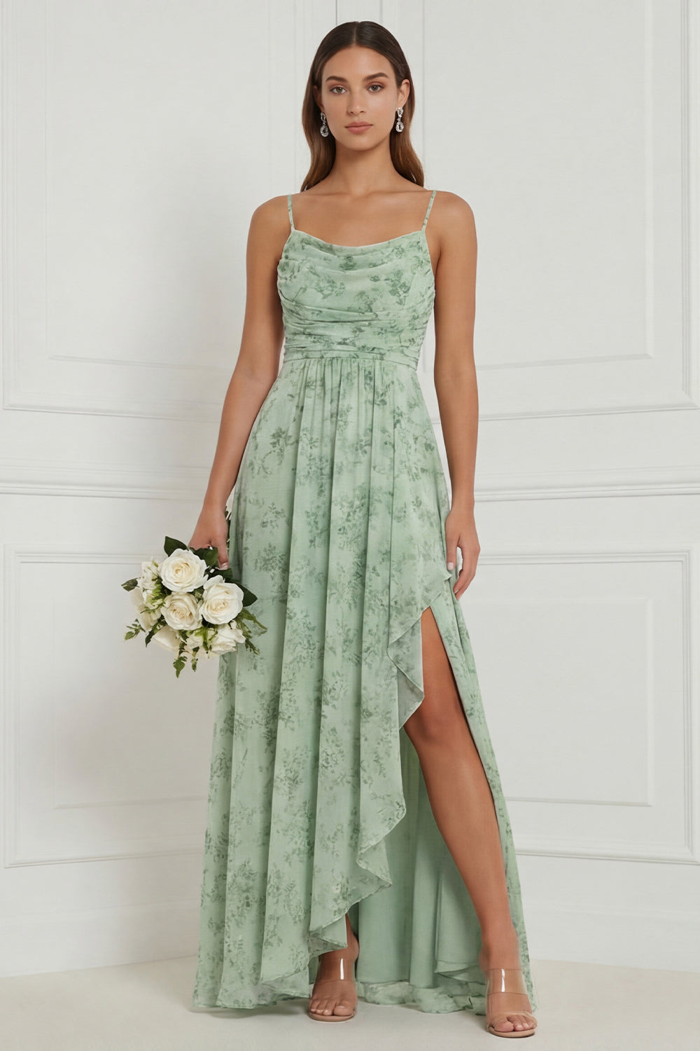 Floral A Line Dusty Sage Bridesmaid Dress with Slit