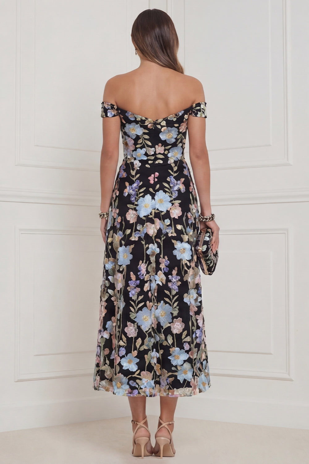 Off the Shoulder Black 3D Flower A Line Midi Wedding Guest Dress