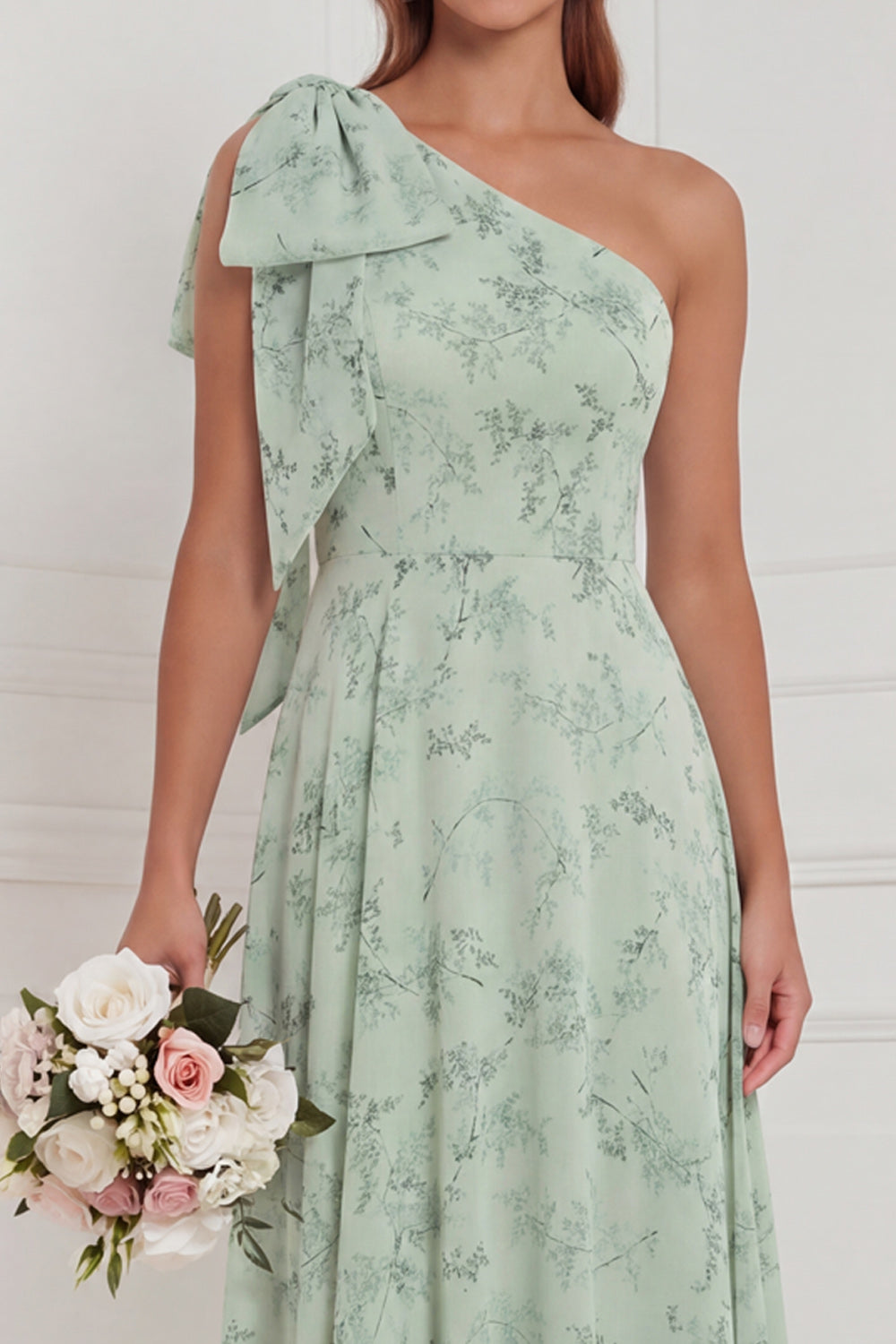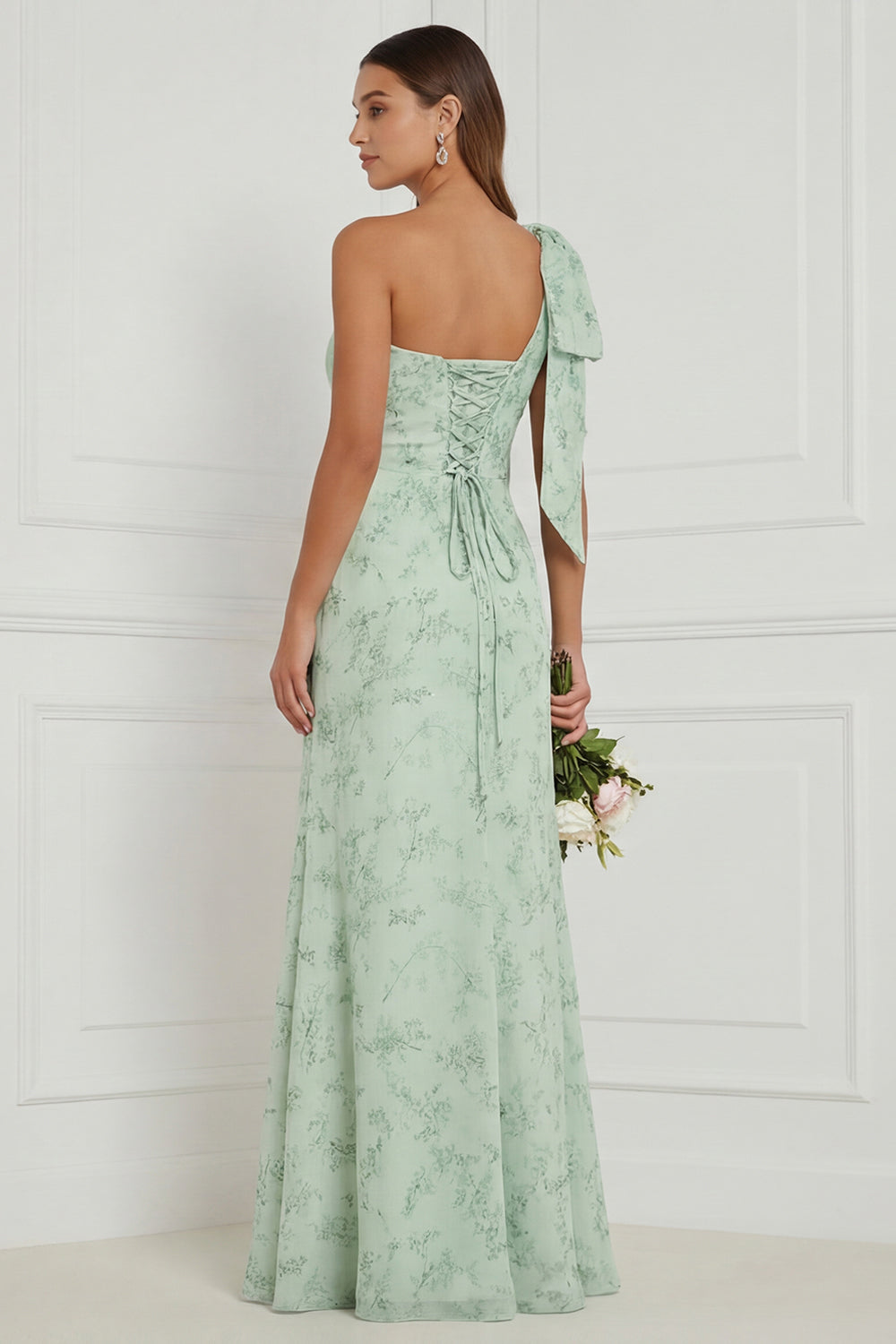 One Shoulder Dusty Sage Floral A Line Long Bridesmaid Dress