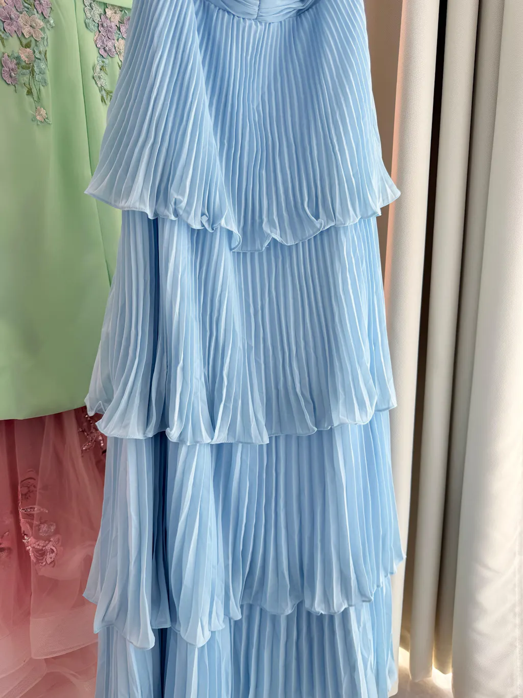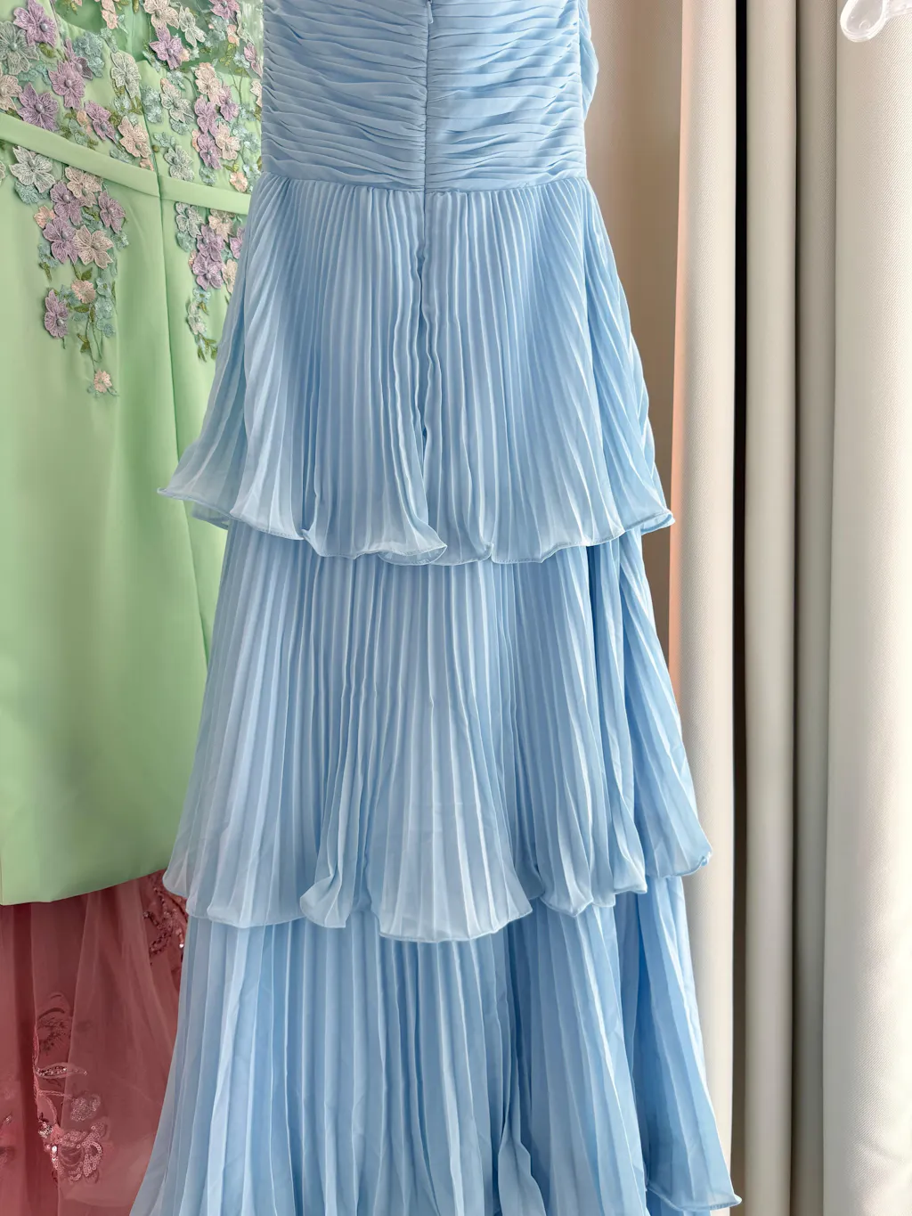I loved how easy this dress was to get into— the back zipper glided smoothly, no struggling or asking for help required. The pleated tiers had just the right amount of flow, and the strapless neckline felt timeless and sophisticated. I wore it to a coastal wedding, and the sky blue color complemented the ocean and beach scenery perfectly. It’s the kind of dress that feels fancy but still low-maintenance.