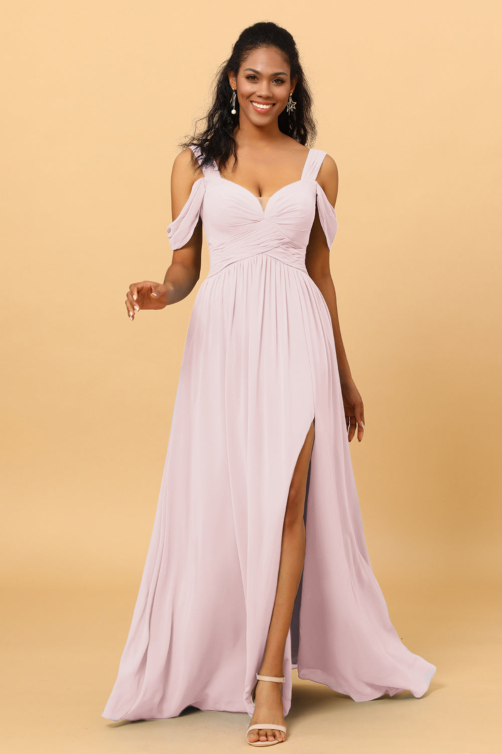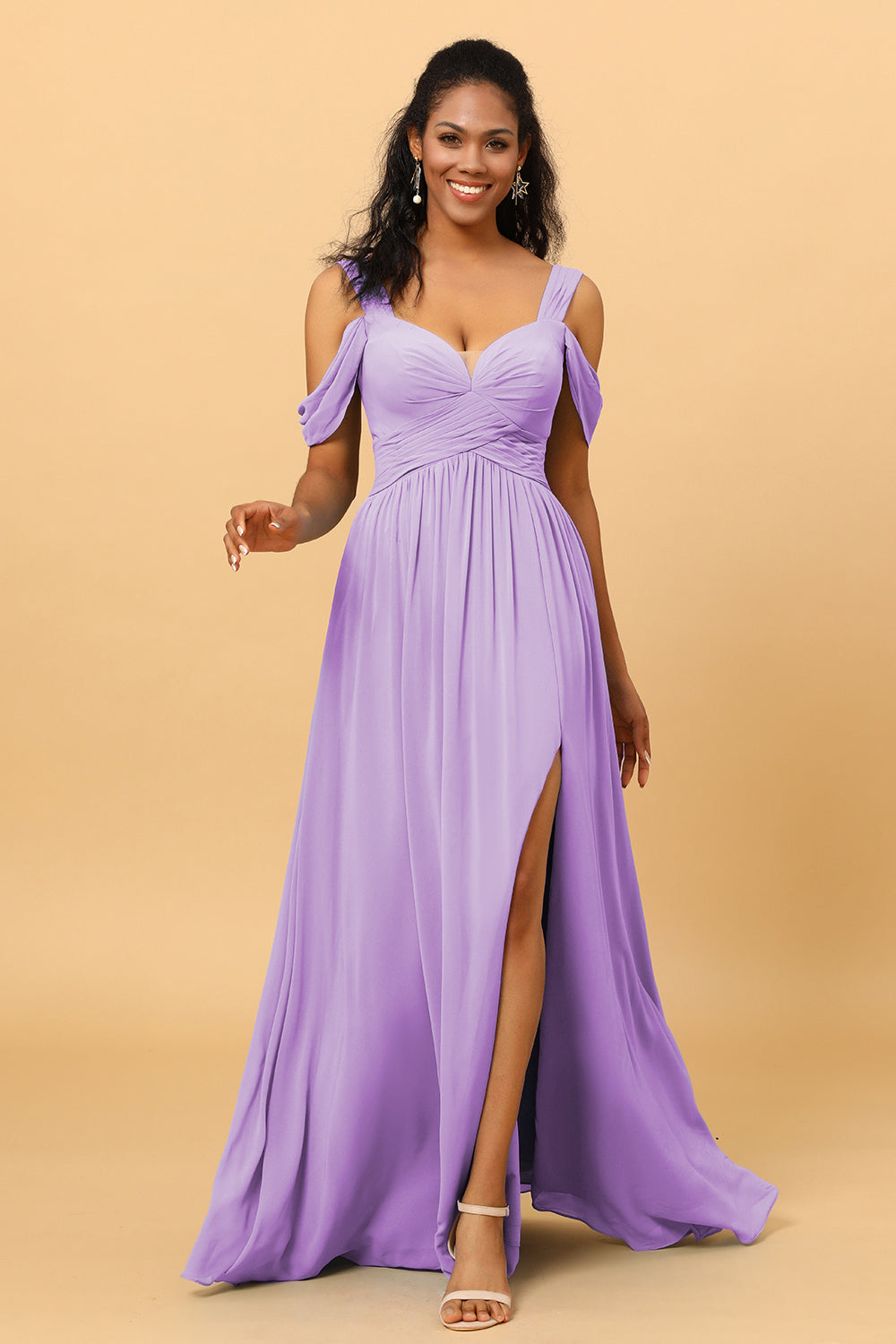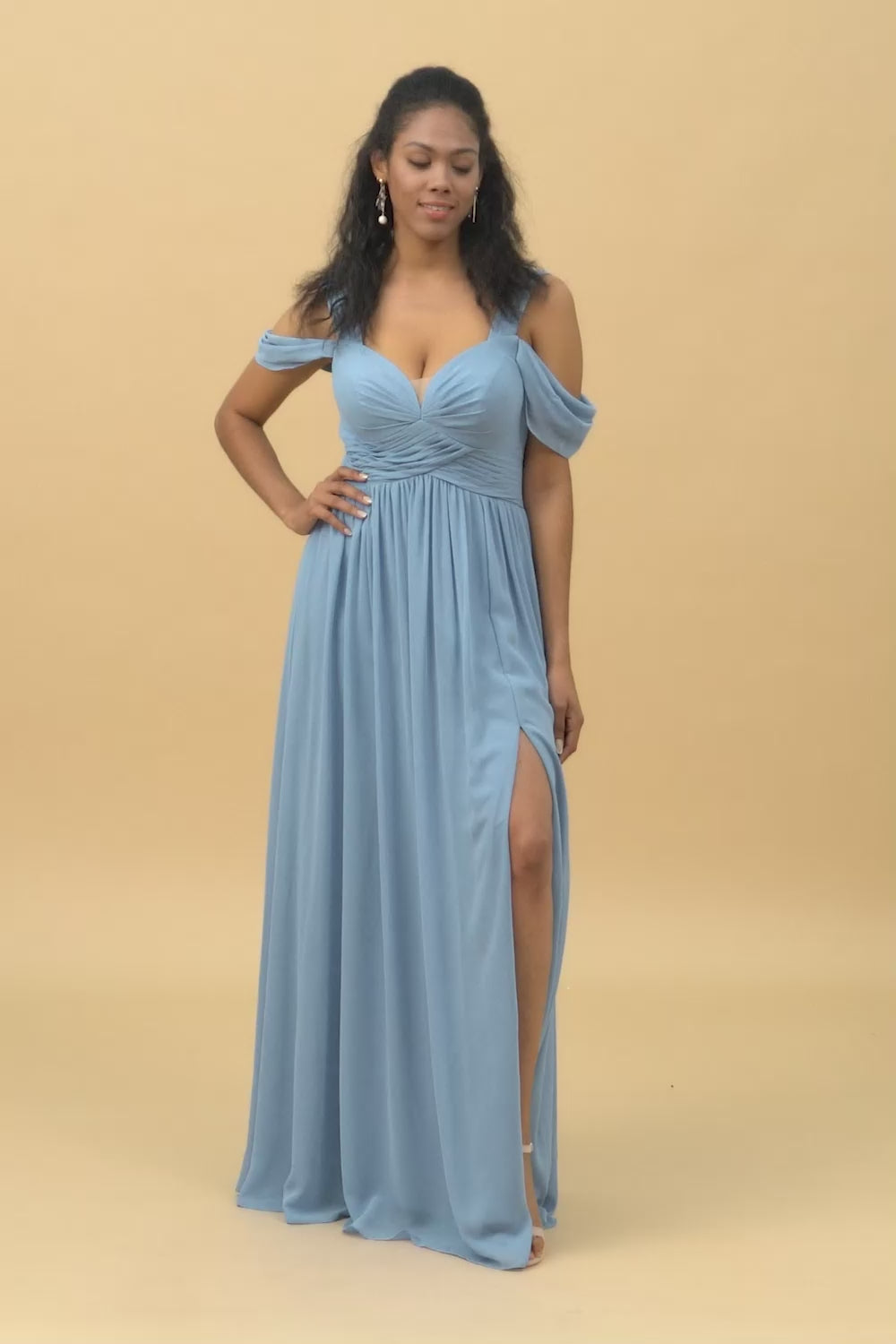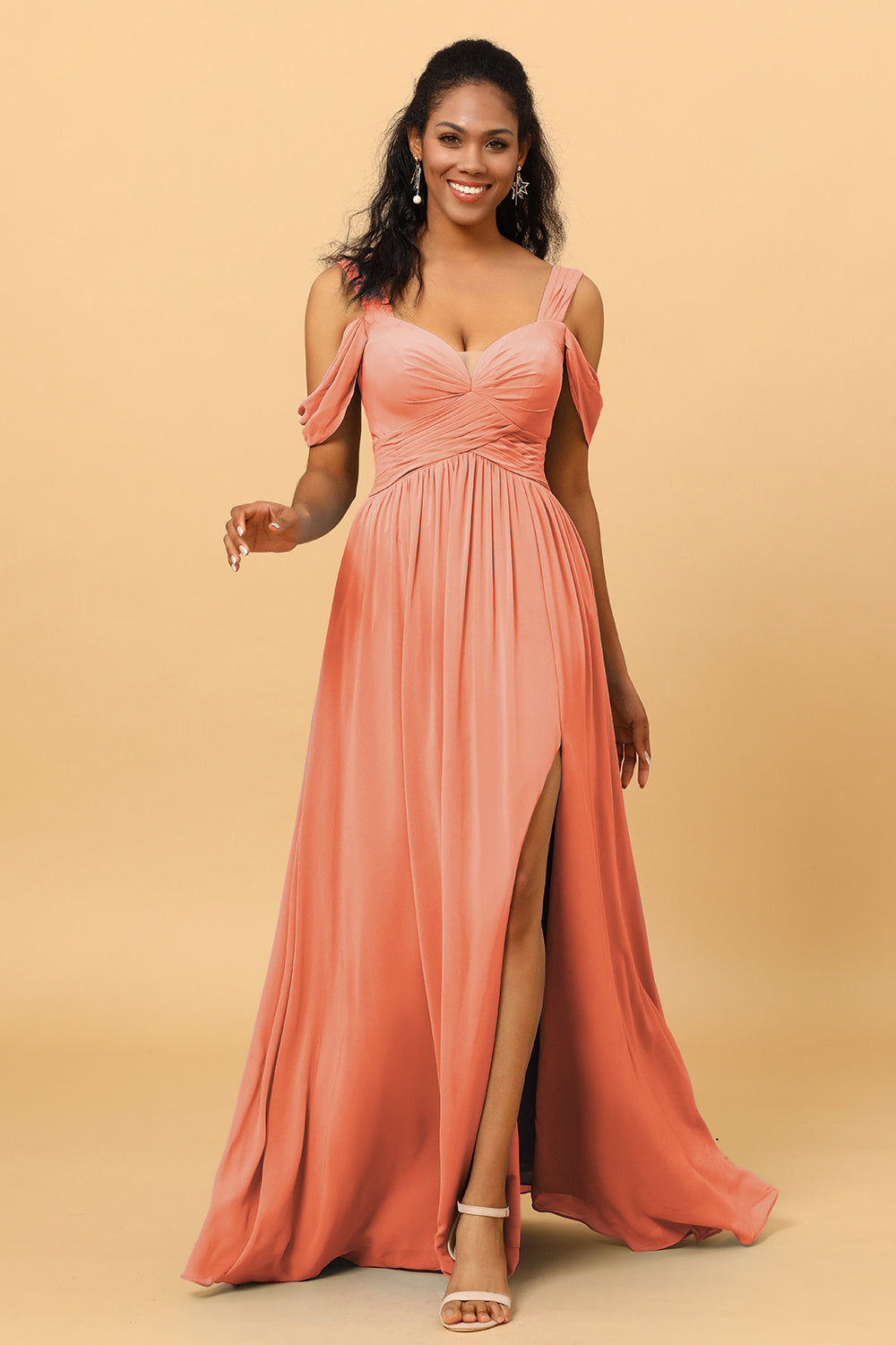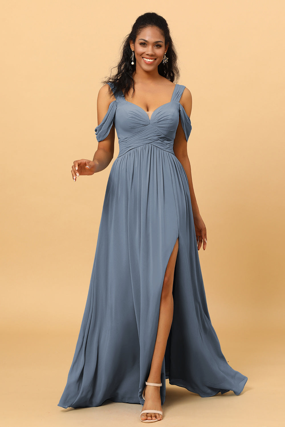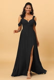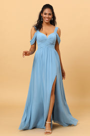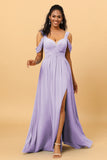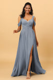 A Line V Neck Cold Shoulder Chiffon Bridesmaid Dress with Slit