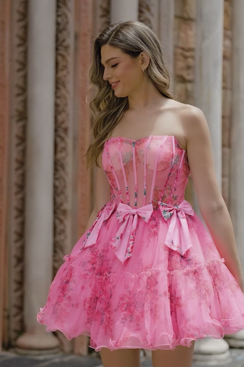 Floral Fuchsia Strapless Corset Short Homecoming Dress with Bowknot