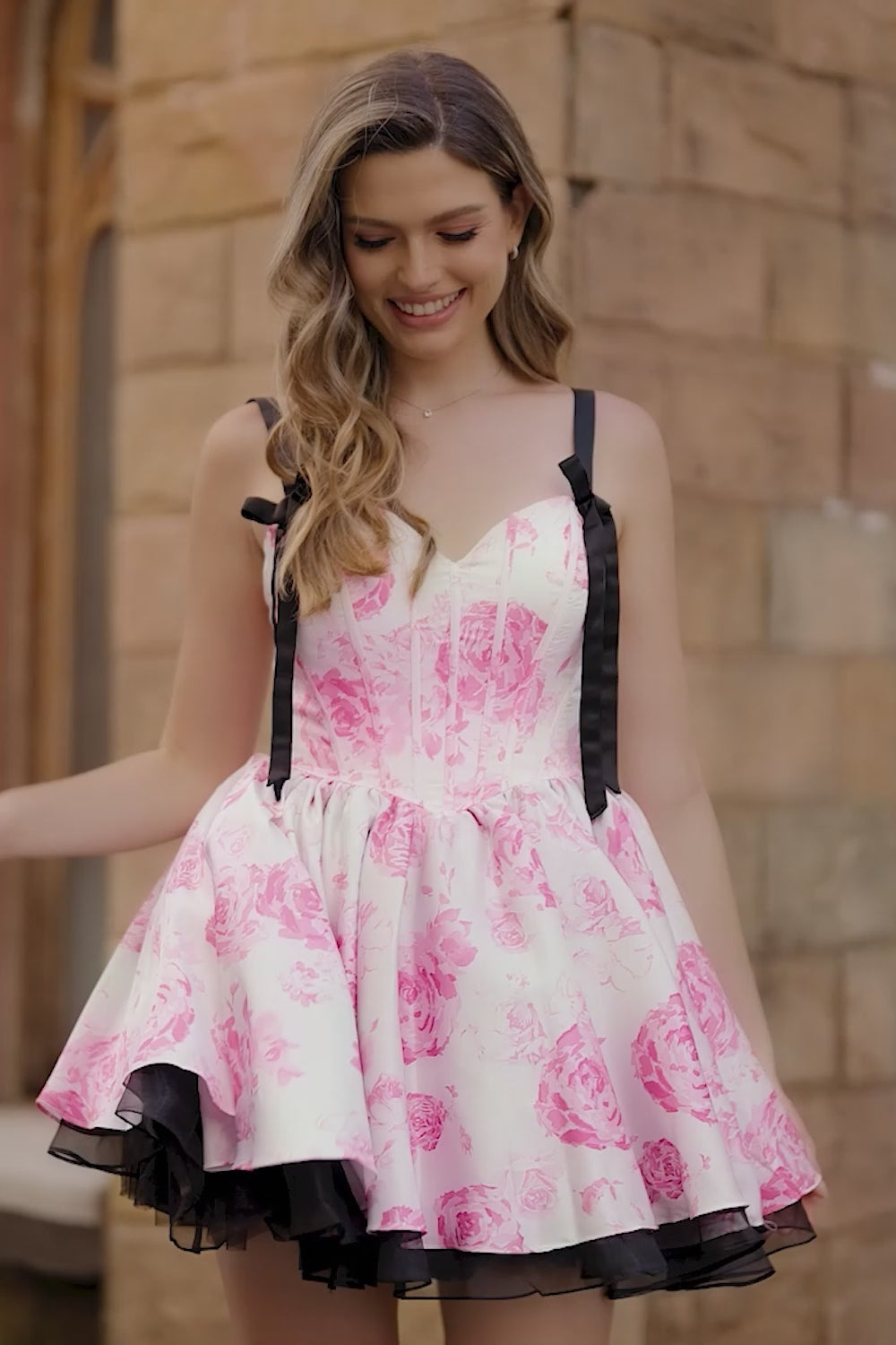 White Fuchsia Floral A Line Corset Short Homecoming Dress with Bow