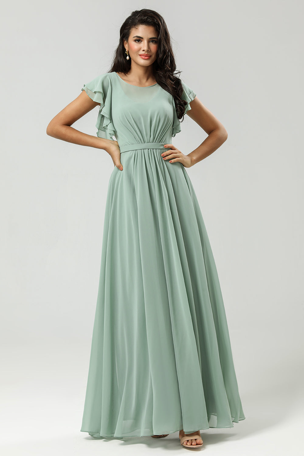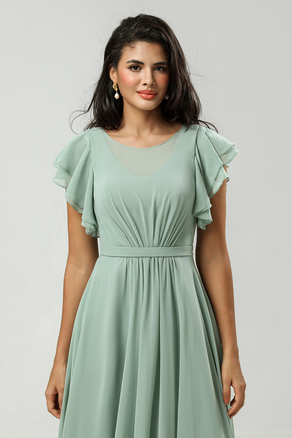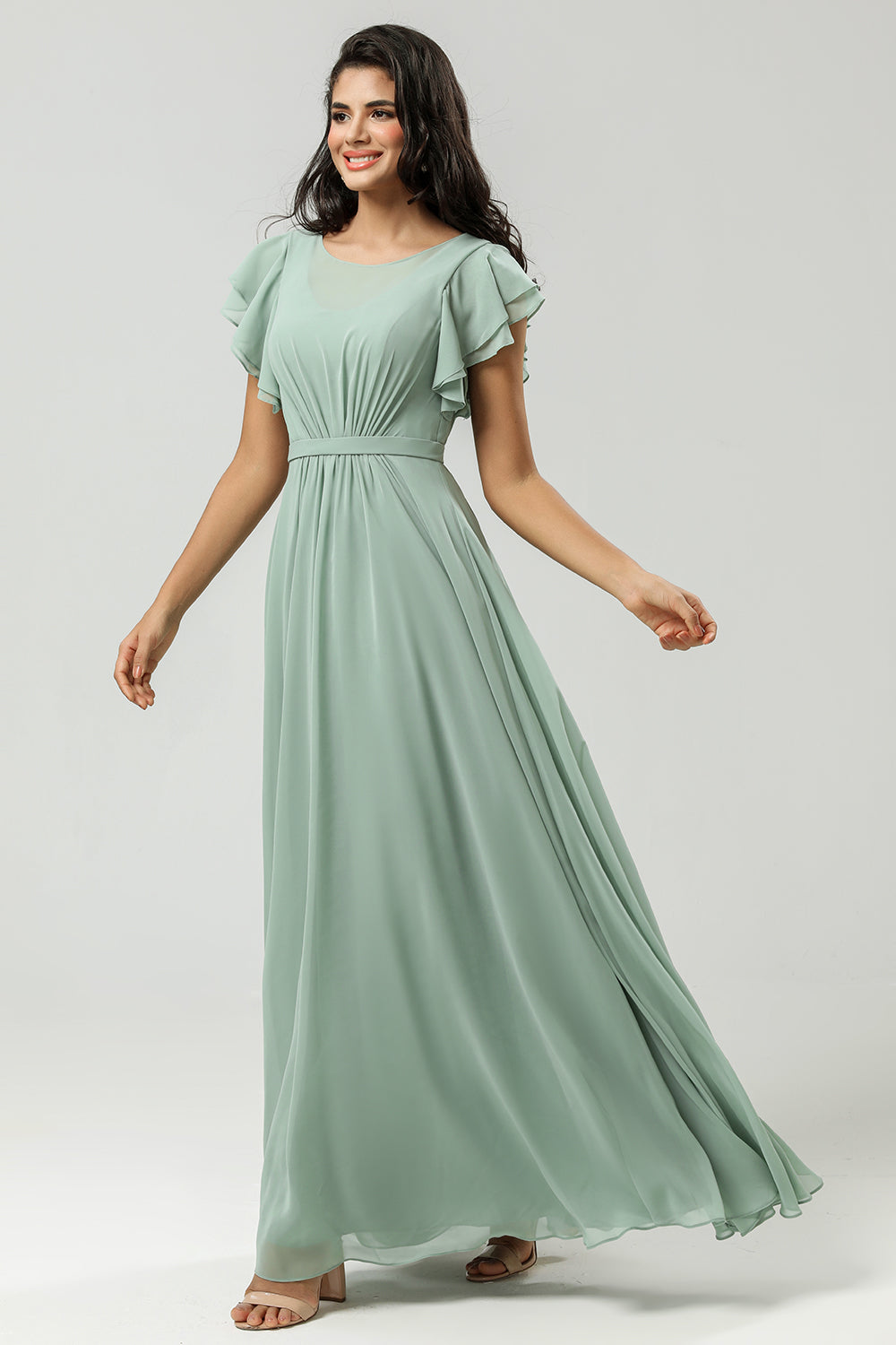 Matcha A Line Round Neck Ruched Floor Length Chiffon Bridesmaid Dress