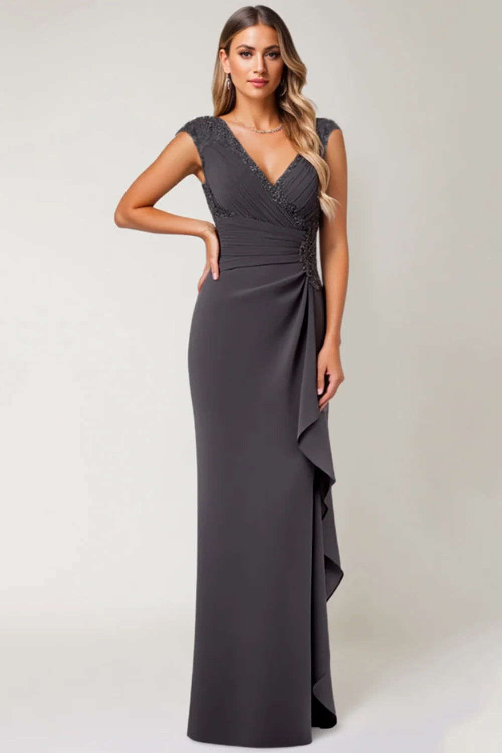 Steel Grey Sheath V-Neck Pleated Mother Of The Bride Dress with Sequins
