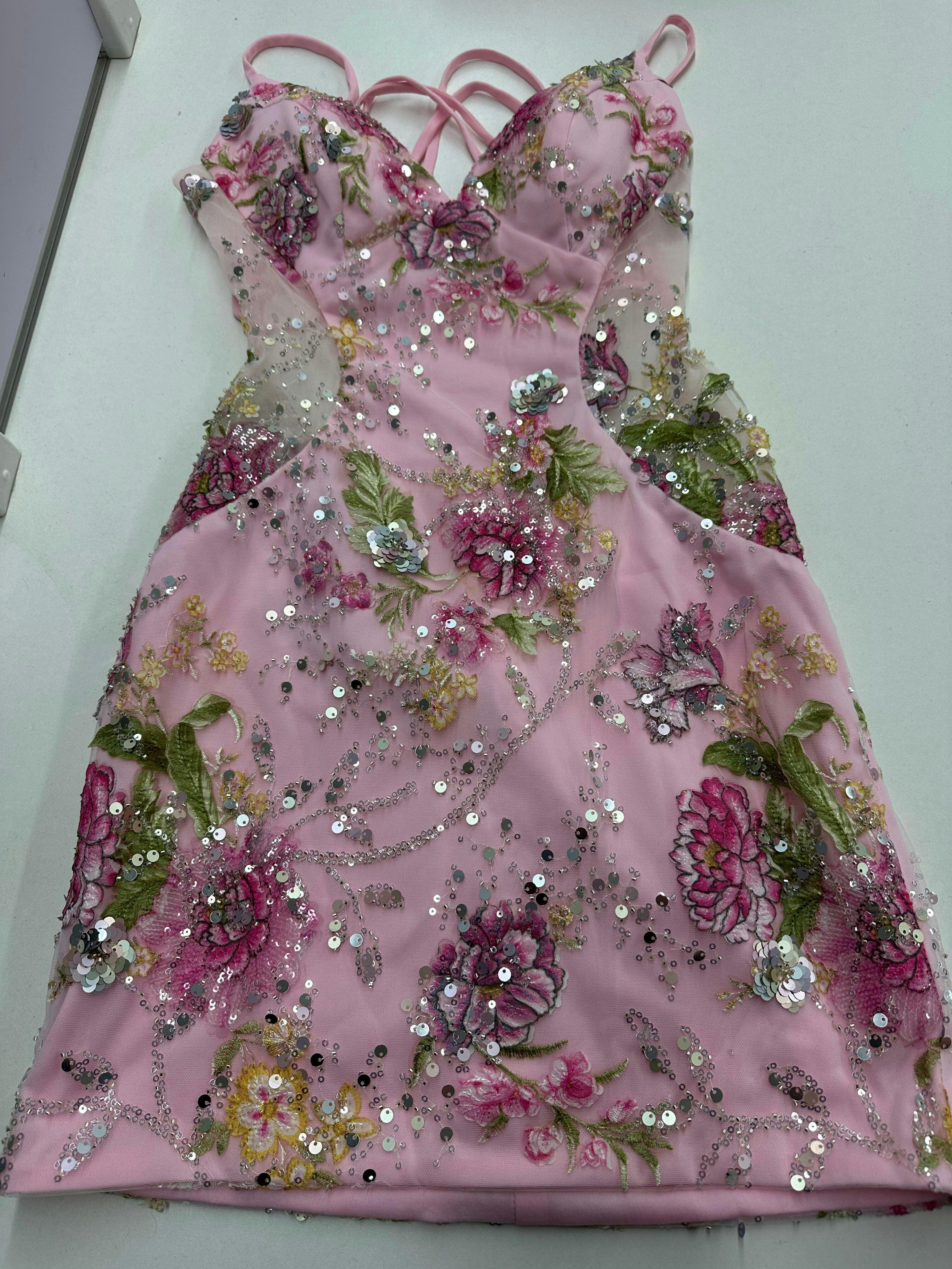 Pink Spaghetti Straps Short Floral Tight Homecoming Dress with Lace Up Back