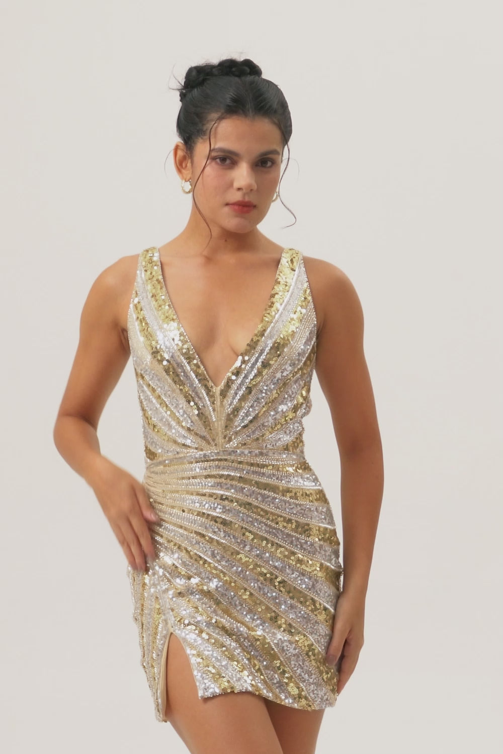Sparkly Sequins Golden V-Neck Backless Short Homecoming Dress