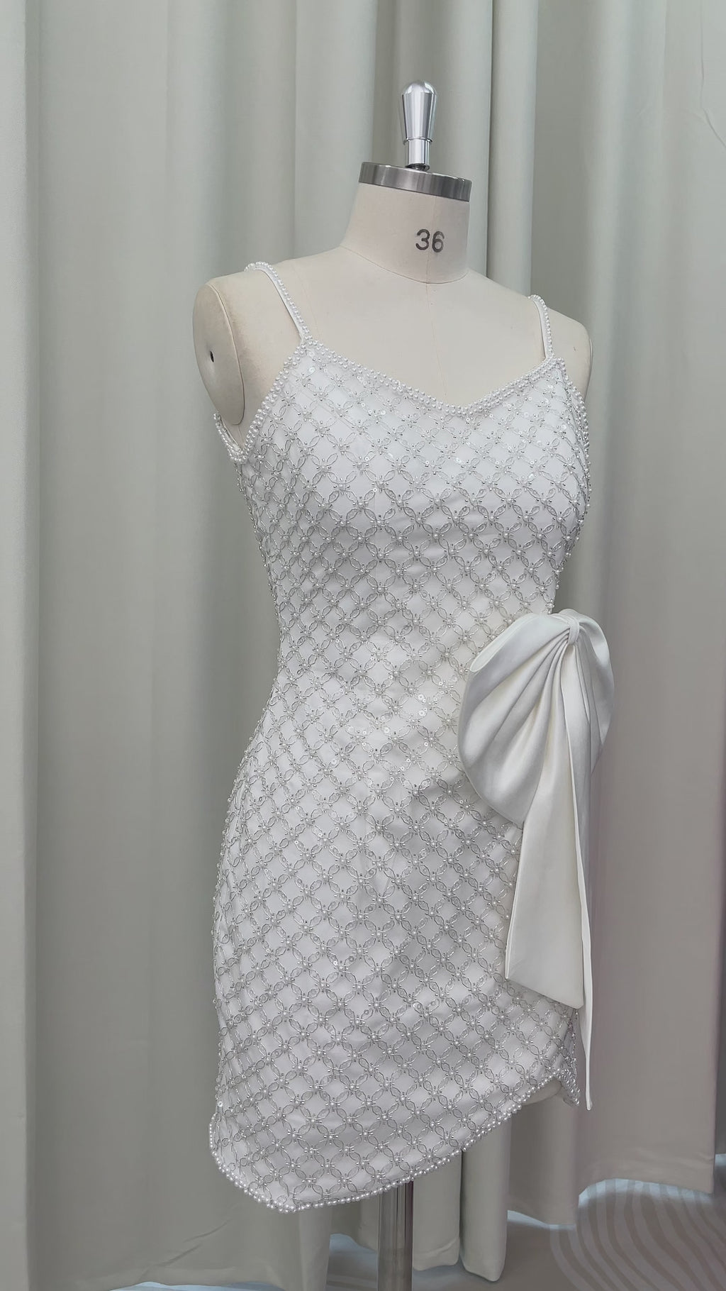 White Bodycon Spaghetti Straps Pearls Sequins Homecoming Dress with Bow