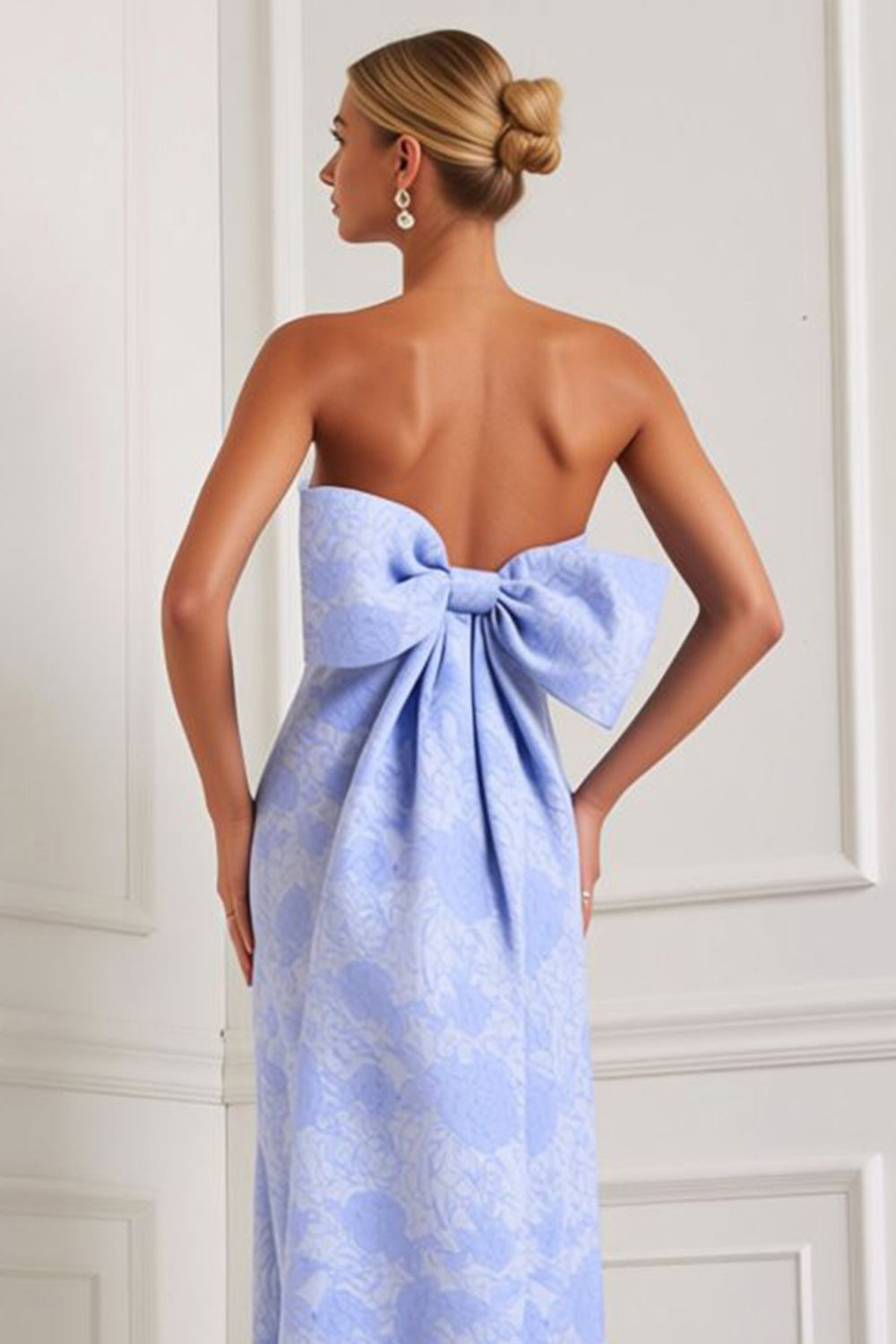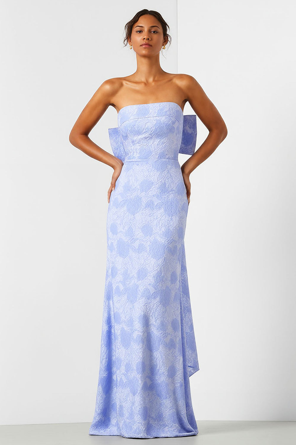 Light Blue Floral Strapless Sheath Satin Long Jacquard Dress with Large Back Bow