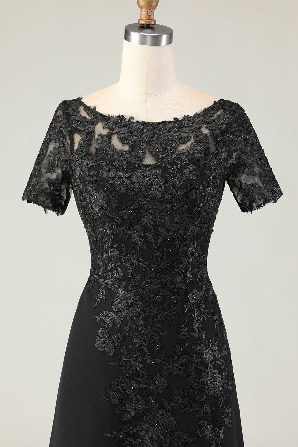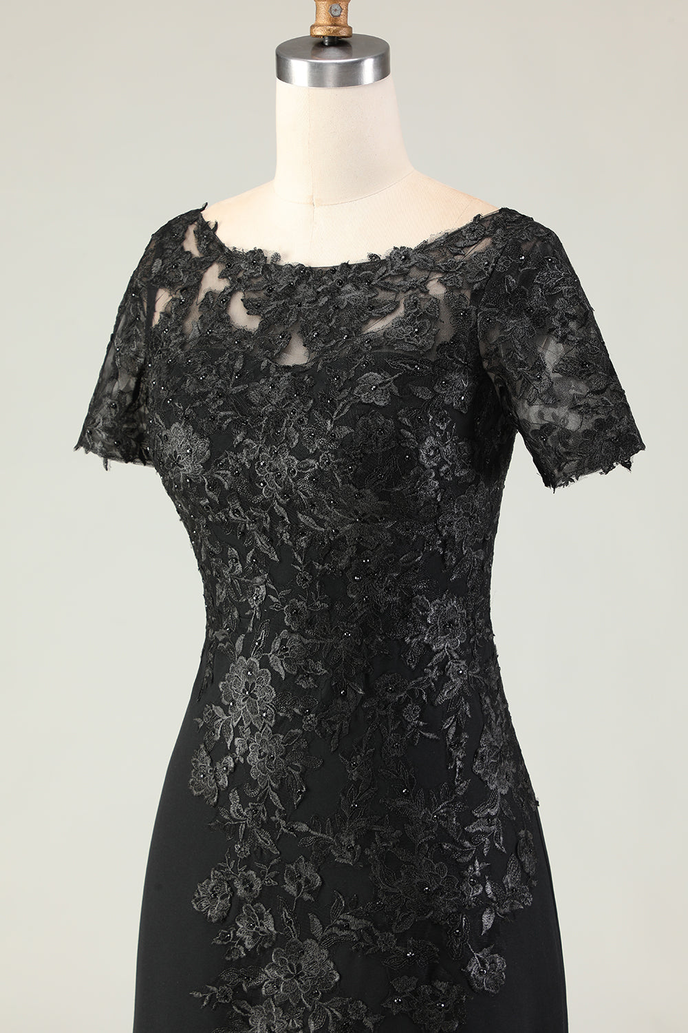Black Mermaid Appliqued Short Sleeves Long Mother Of The Bride Dress with Slit