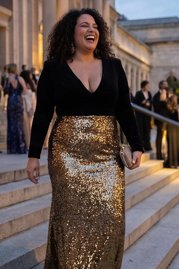 Wore this to a Hollywood-style gala and felt like a A-lister! The black velvet top is so luxe and soft, and the gold sequin skirt catches every light—total head-turner. The deep V is sexy but classy, and the long sleeves add just the right amount of elegance. I got stopped for photos all night, and my Instagram feed blew up. Worth every penny for that red-carpet vibe!