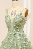 Green A Line Spaghetti Straps Tulle Long Prom Dress With Appliques