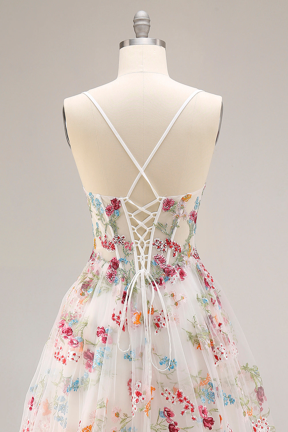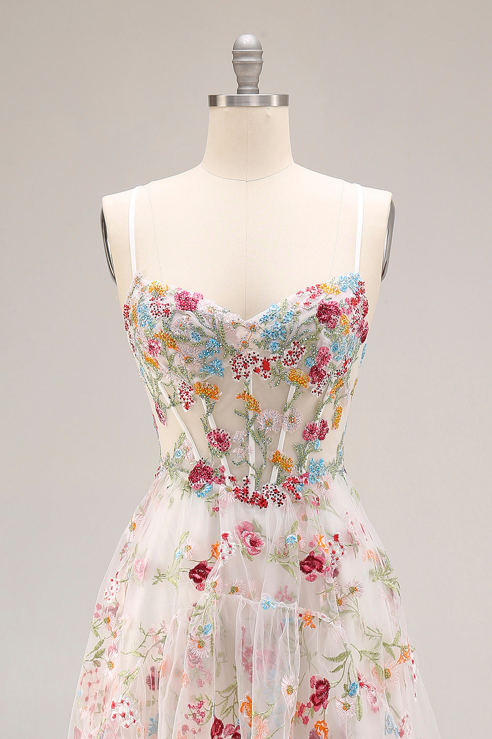 Ivory Flower Embroidered A-Line Beaded Corset Long Prom Dress with Slit