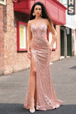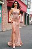 Rose Golden Mermaid Ruched Sparkly Sequin Corset Beaded Long Prom Dress with Slit