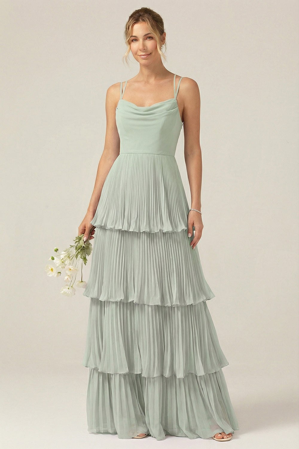Dusty Sage Cowl Neck A Line Tiered Pleated Long Bridesmaid Dress