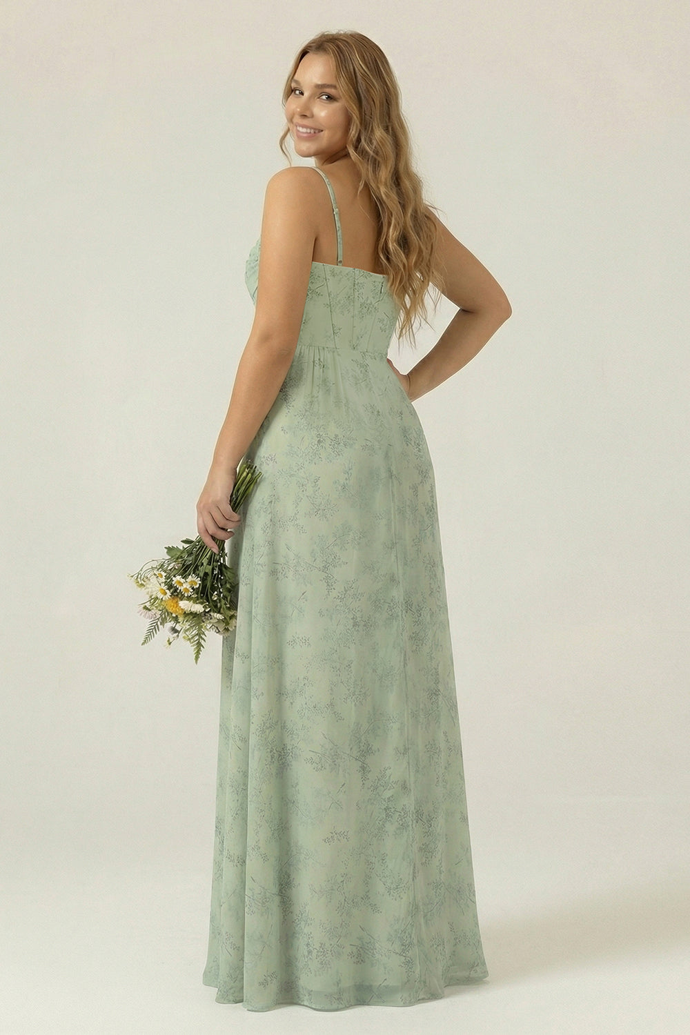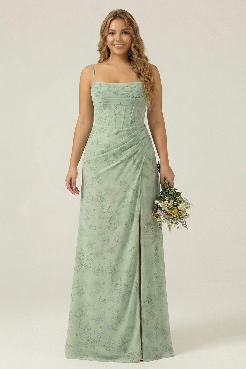 Dusty Sage Sheath Spaghetti Straps Pleated Long Plus Size Bridesmaid Dress with Slit