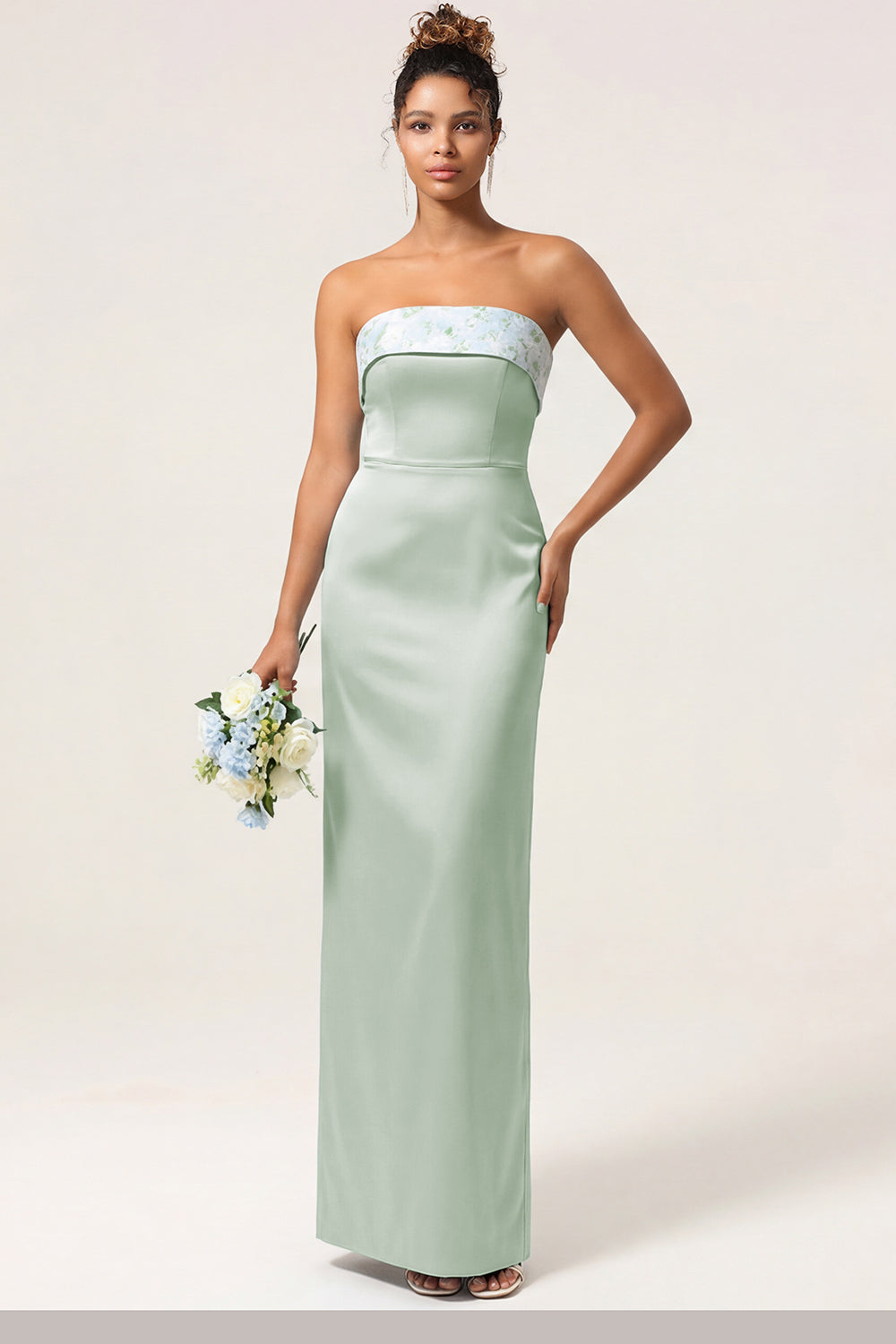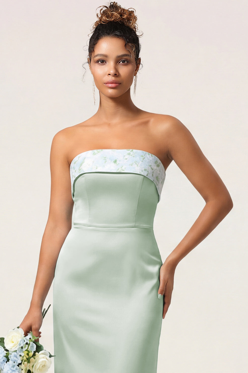 Green Flower Sheath Strapless Satin Long Bridesmaid Dress with Bow