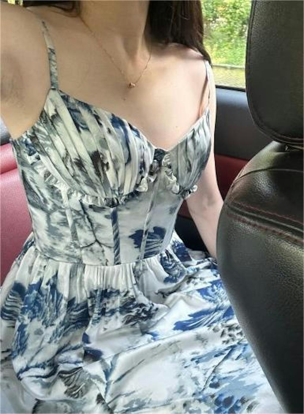 Blue Printed A-Line Spaghetti Straps Pleated Long Bridesmaid Dress With Slit