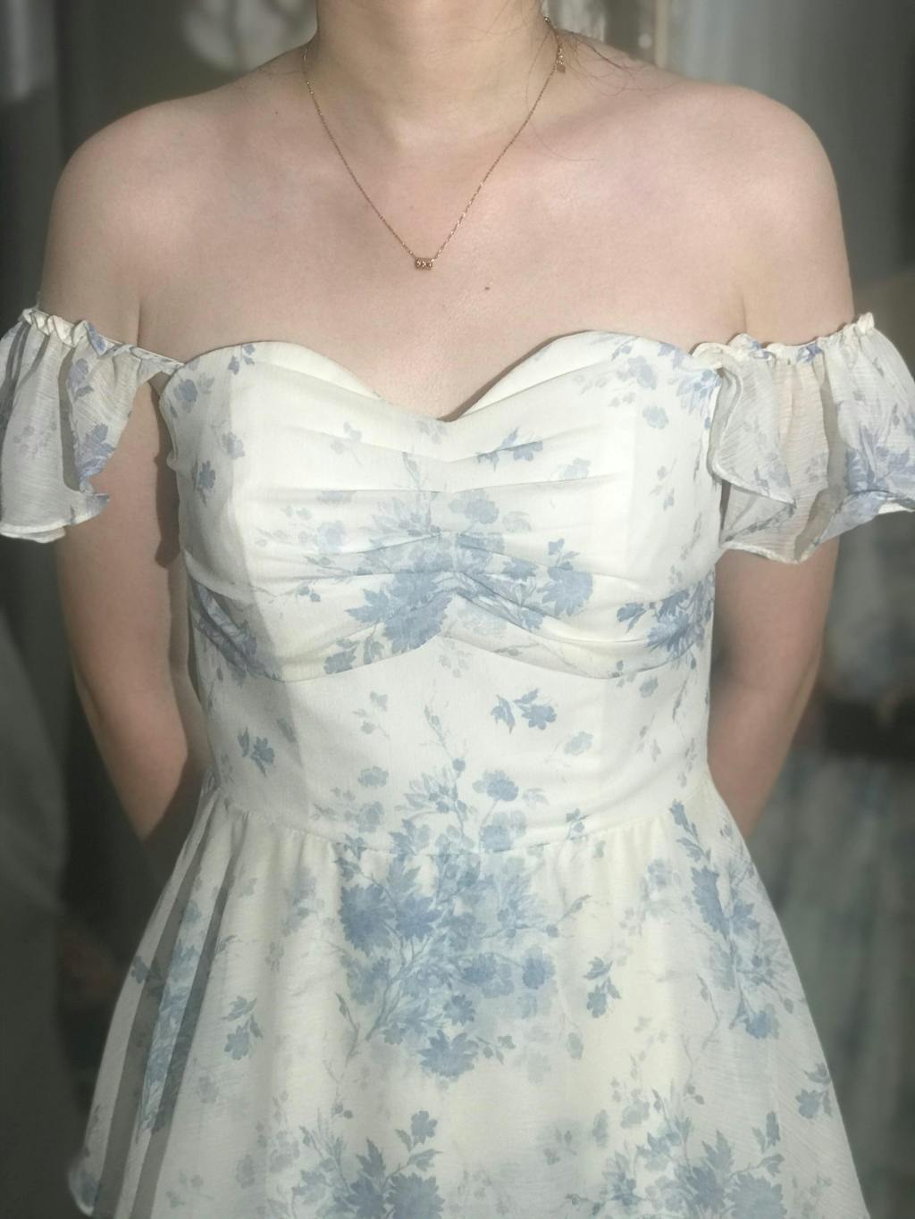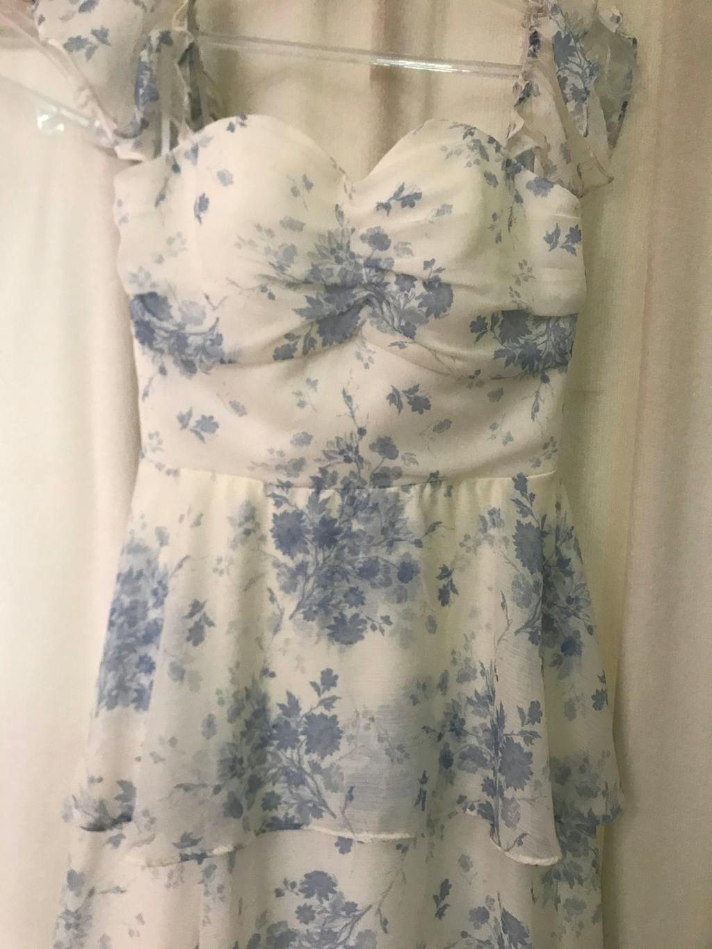 White Blue Floral A-Line Off The Shoulder Tiered Print Bridesmaid Dress