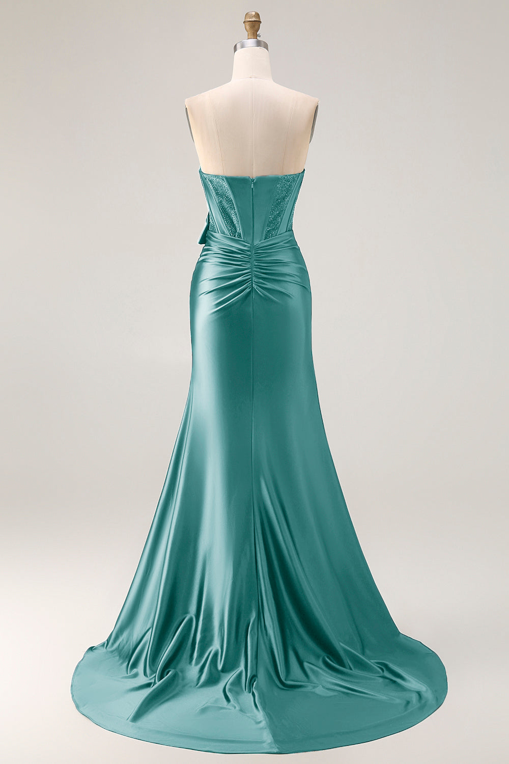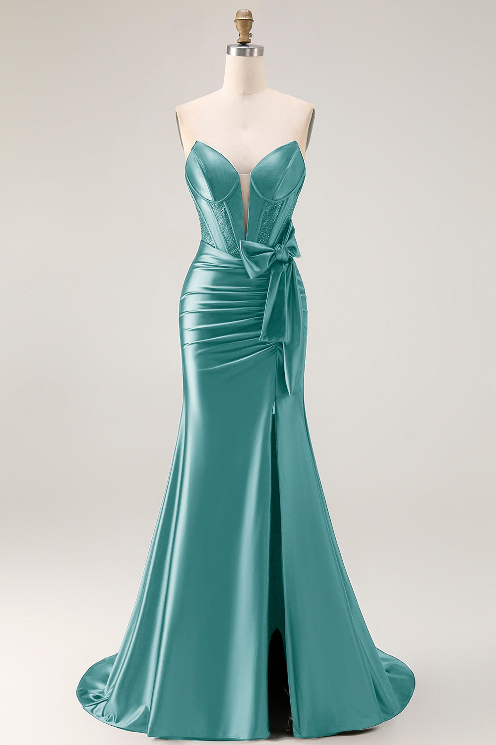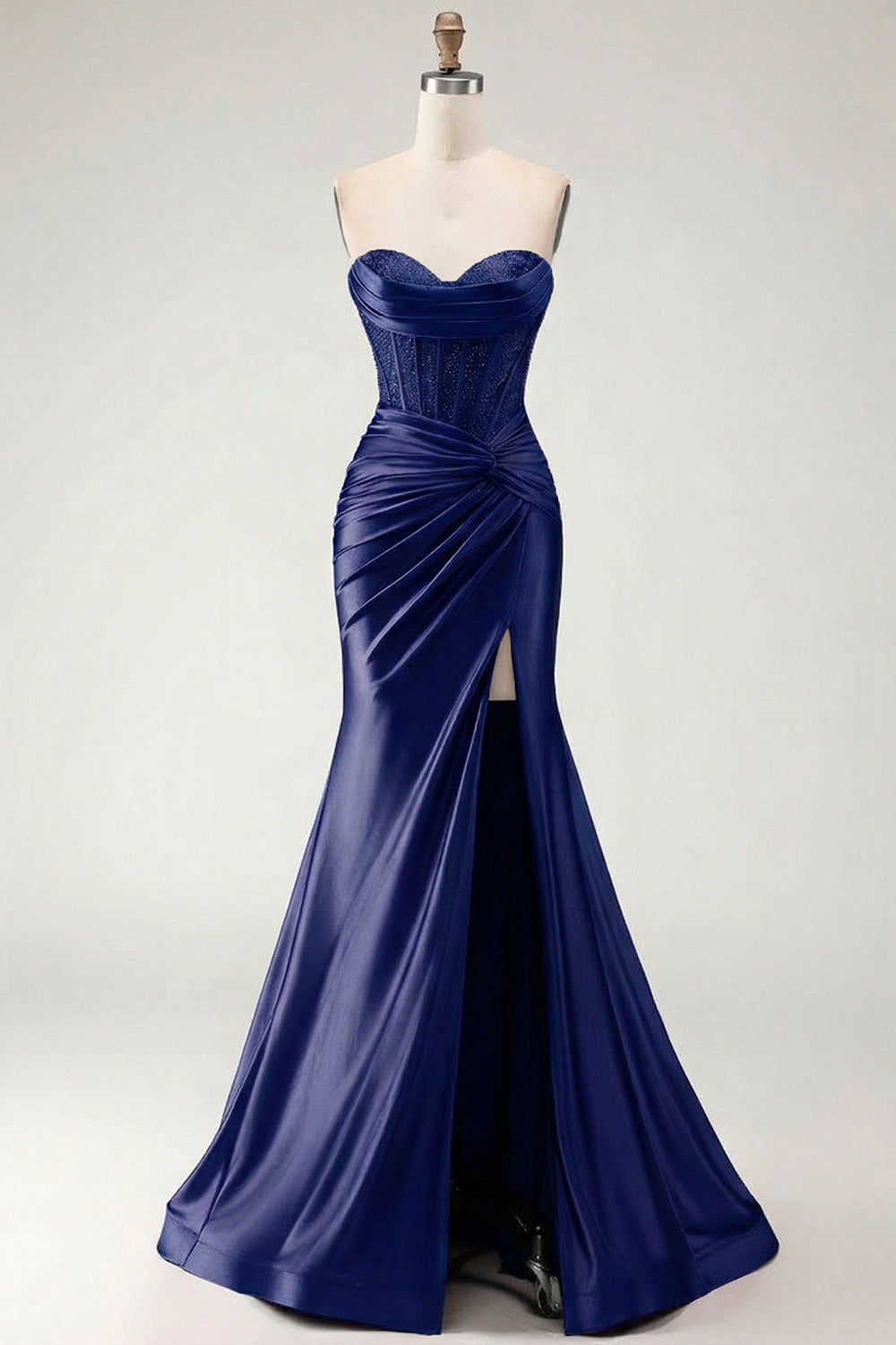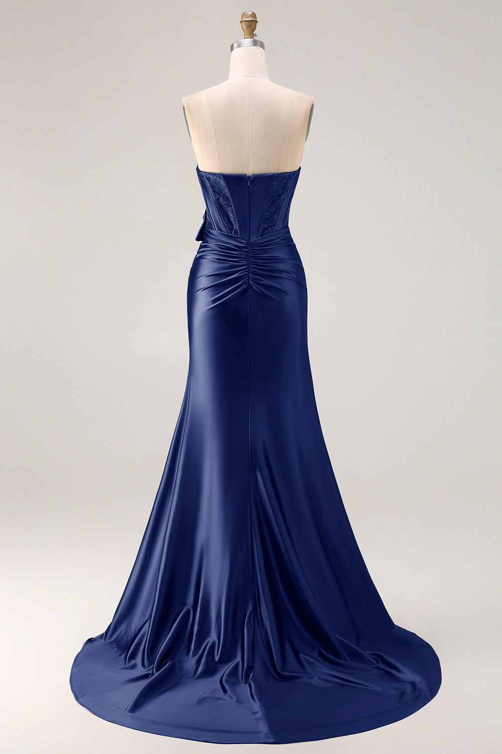 Navy Mermaid Strapless Corset Beaded Satin Long Prom Dress with Bow