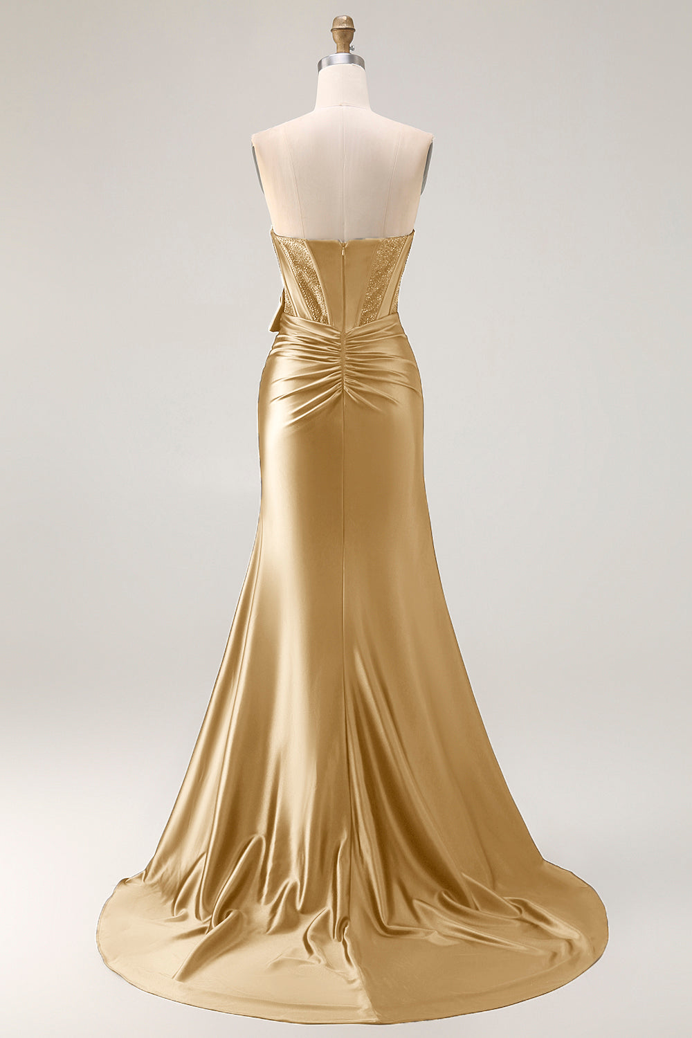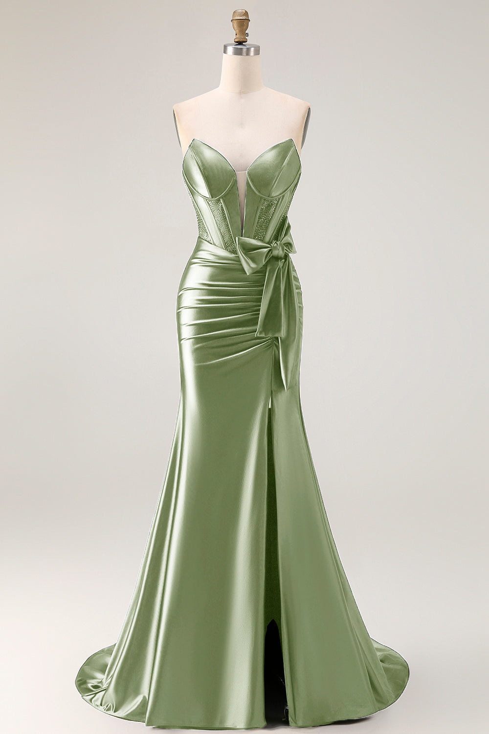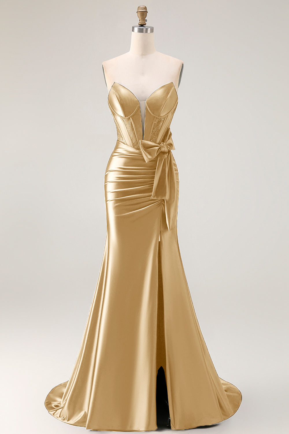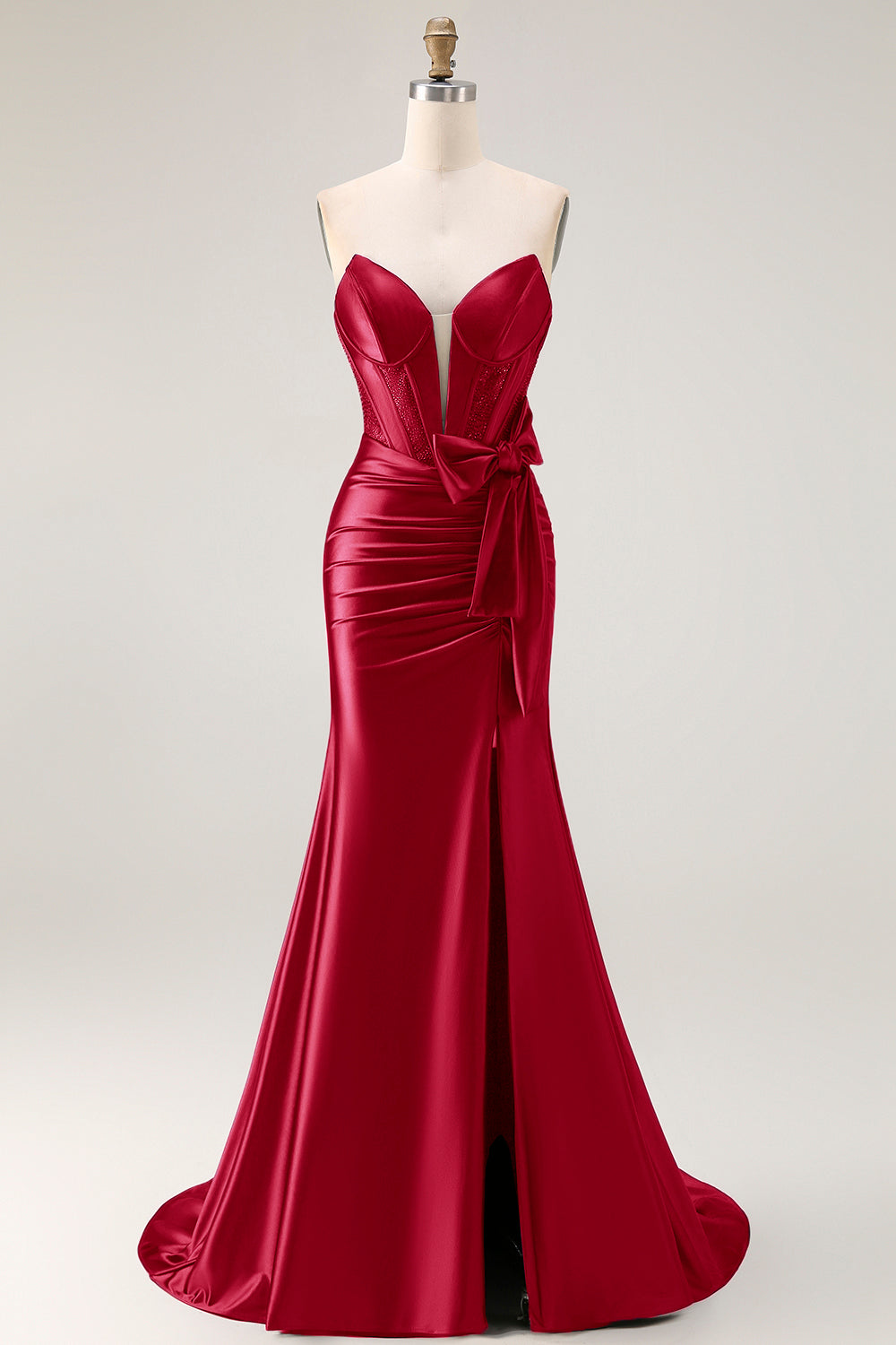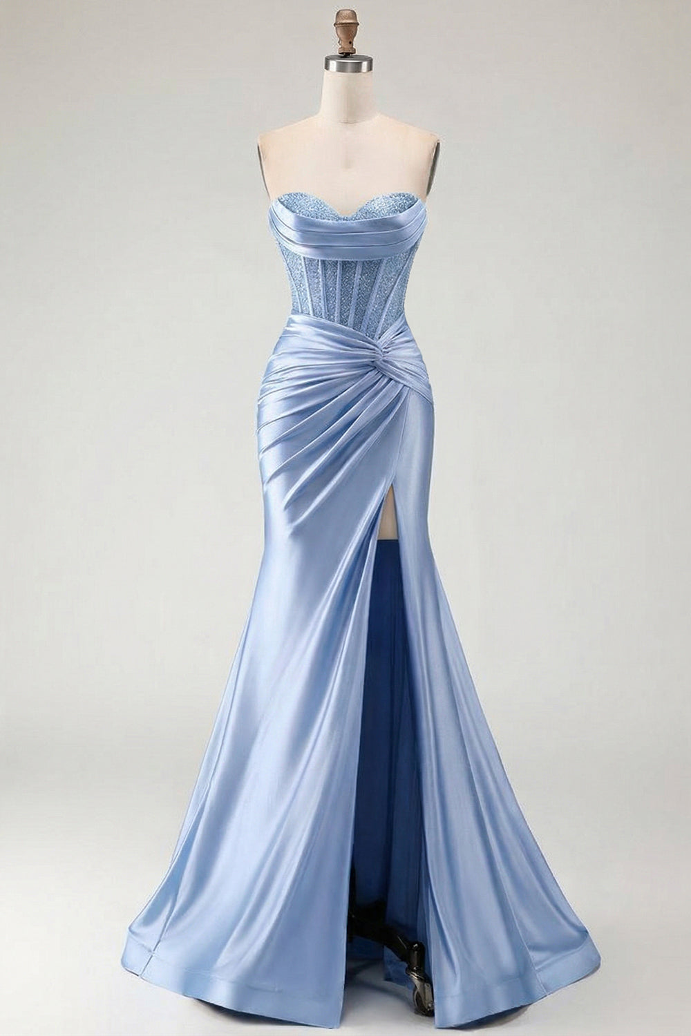 Navy Mermaid Strapless Corset Beaded Satin Long Prom Dress with Bow