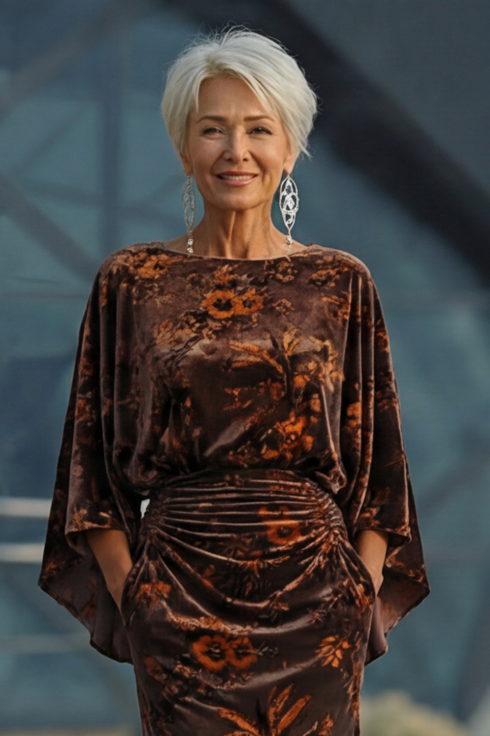 Peacock Blue Velvet Burnout Sheath Maxi Mother of the Bride Dress with Cape Sleeves