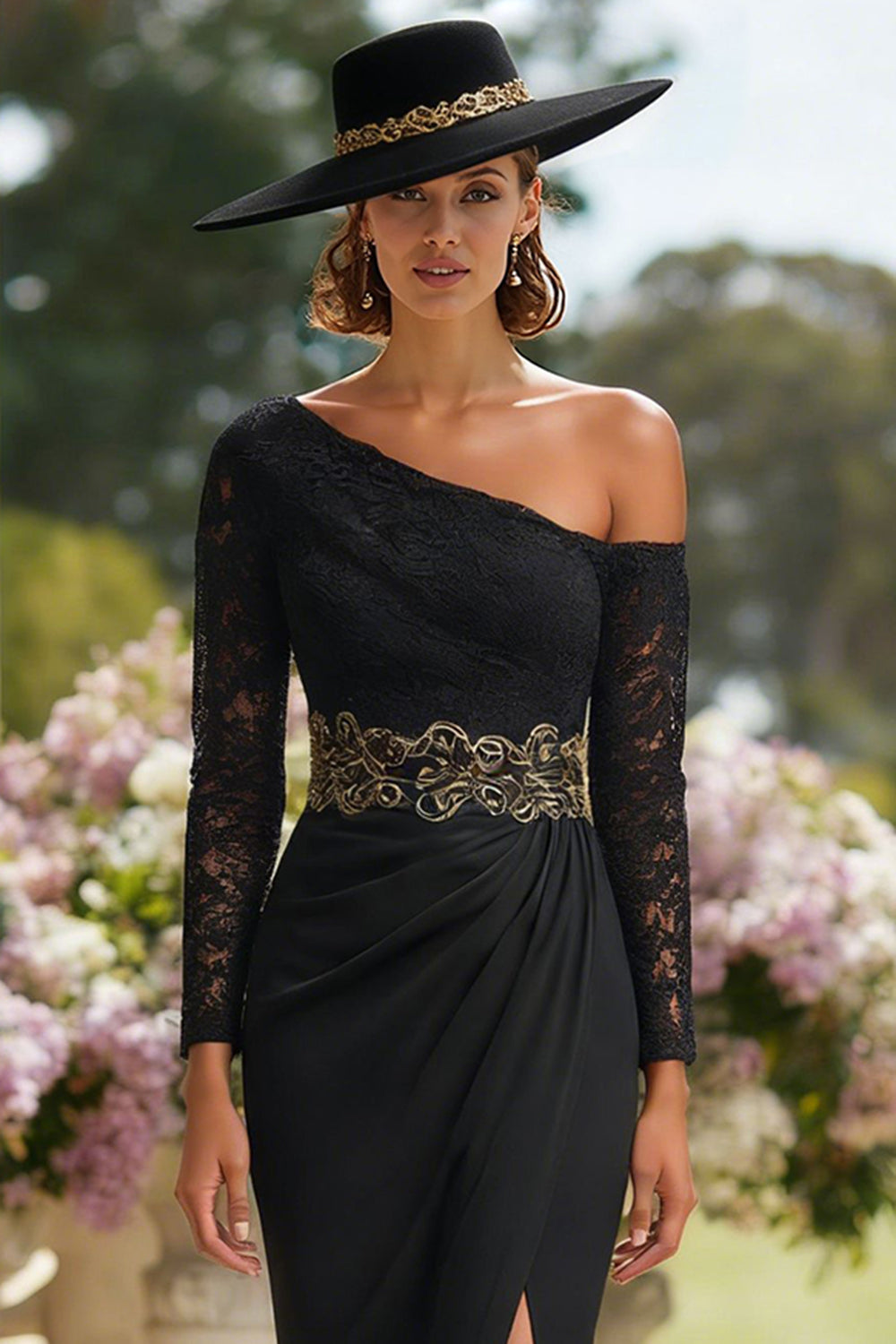 Black One Shoulder Sheath Lace Long Sleeve Mother of the Bride Dress with Slit