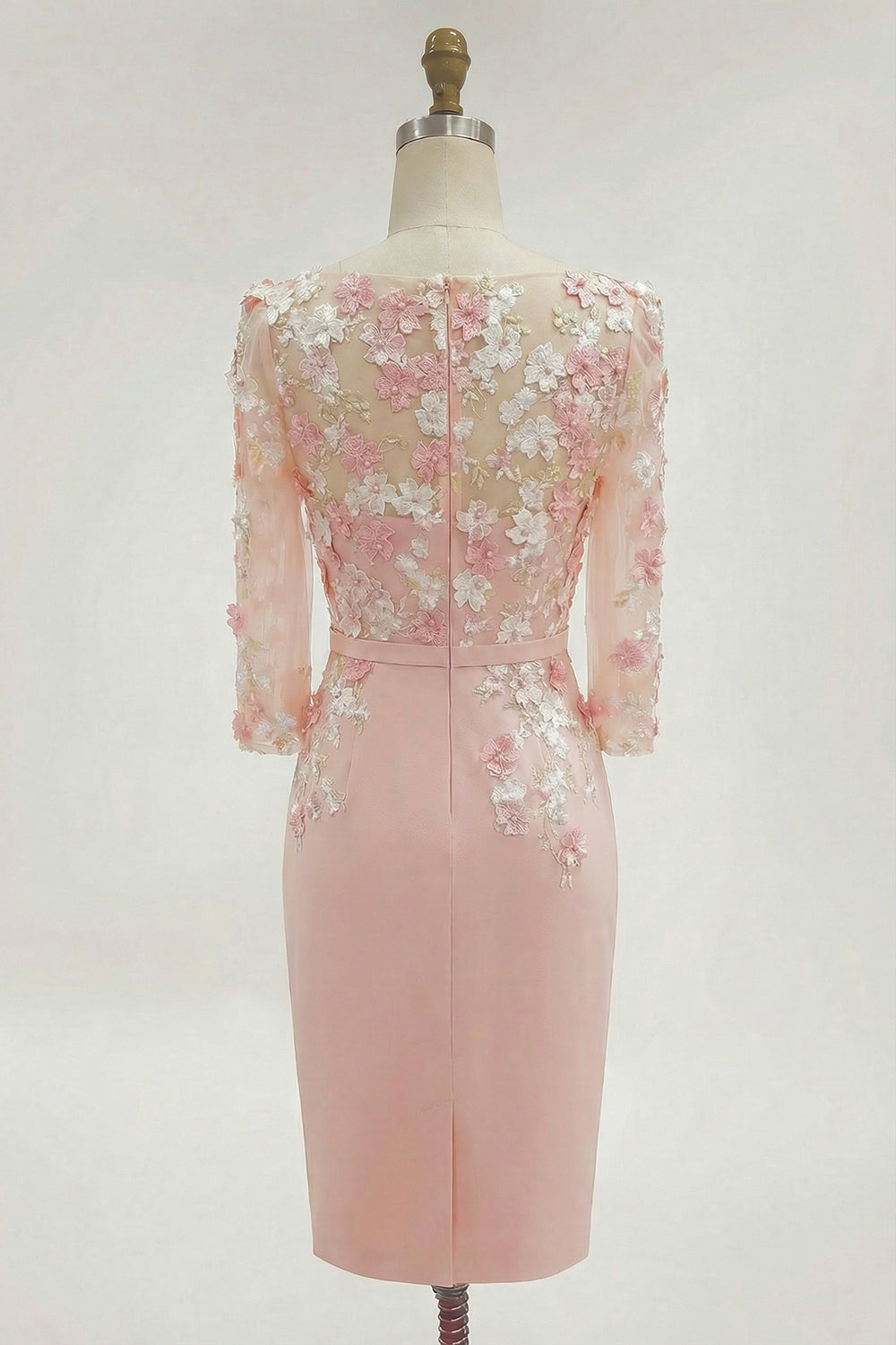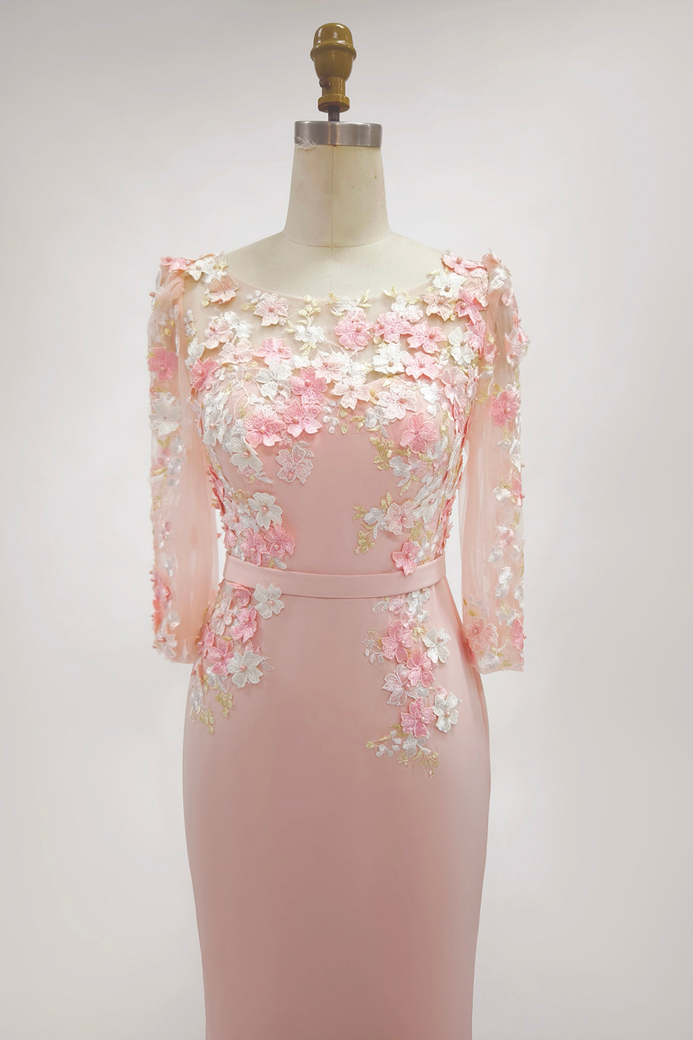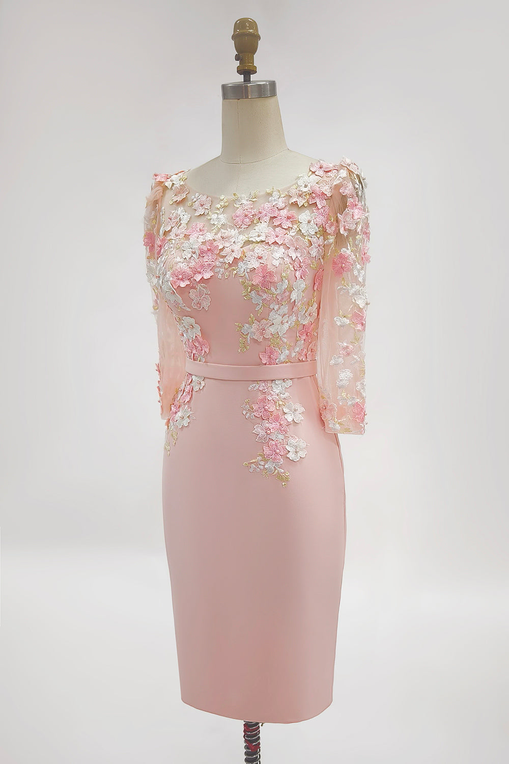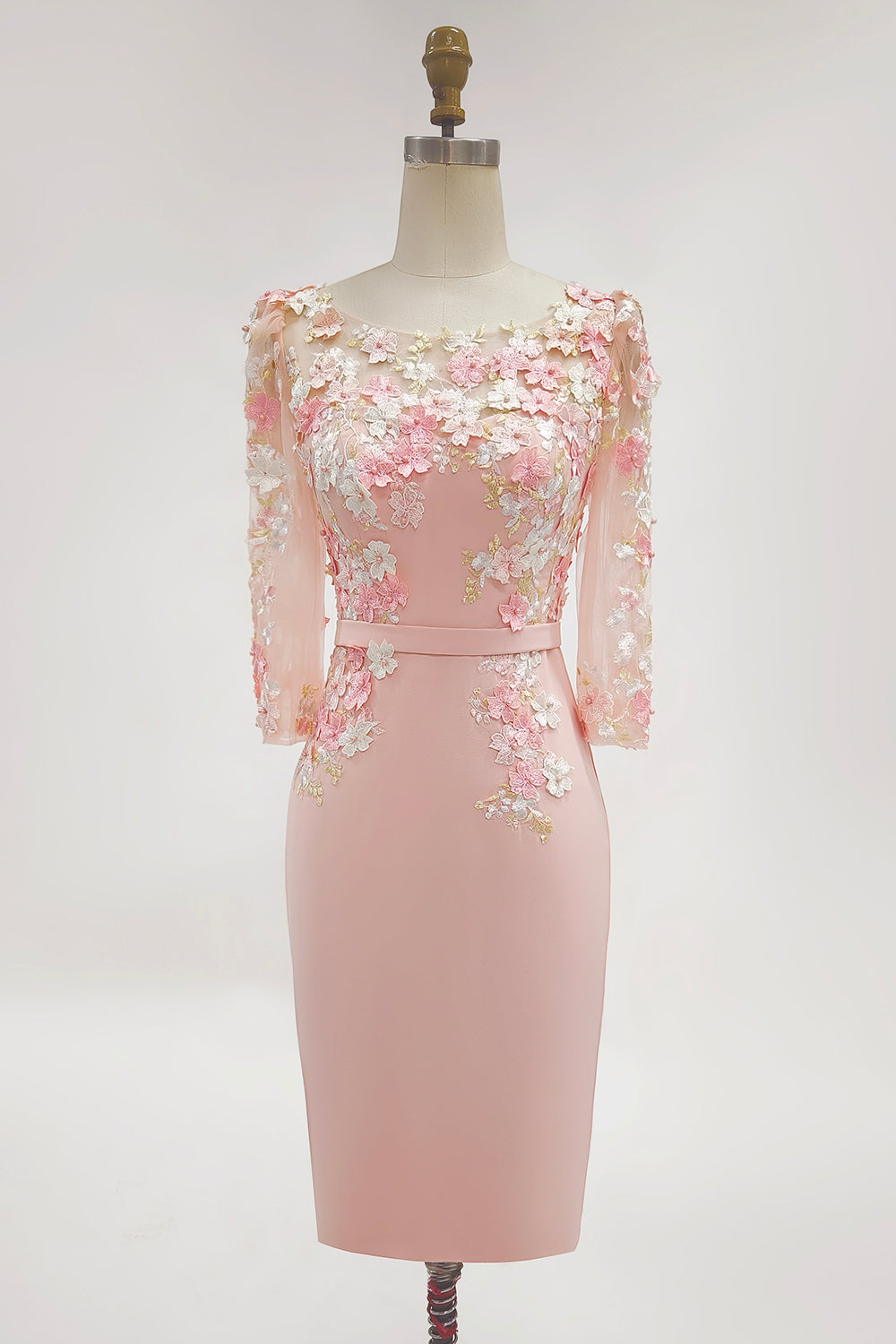 Blush Pink Sheath Round Neck Long Sleeve Mother of the Bride Dress with 3D Flowers