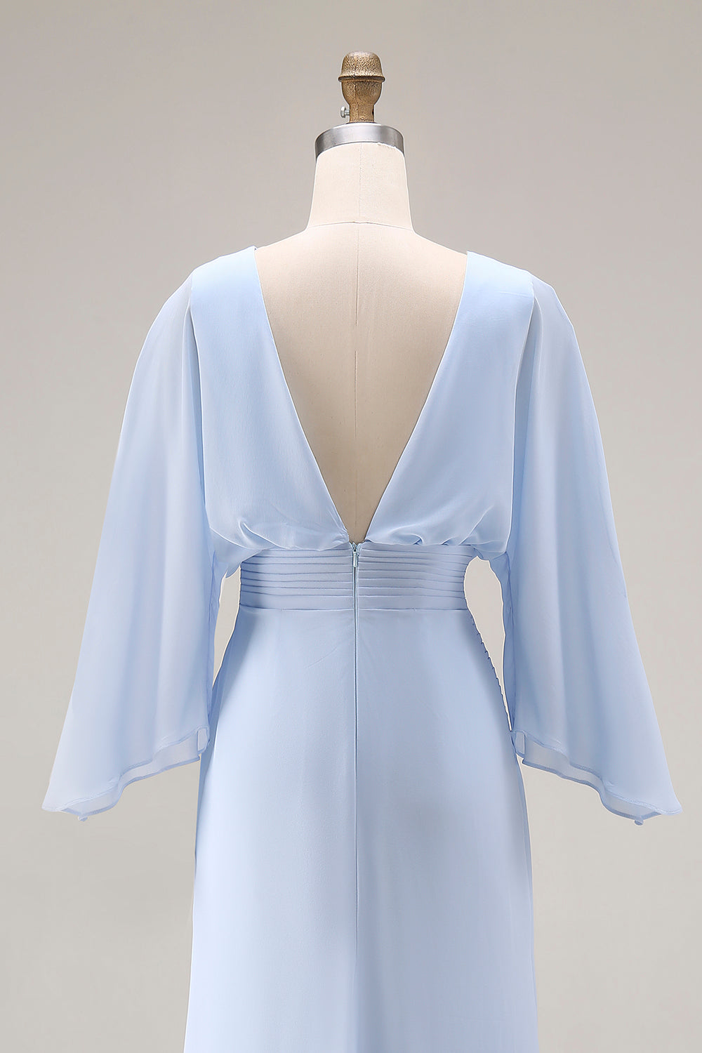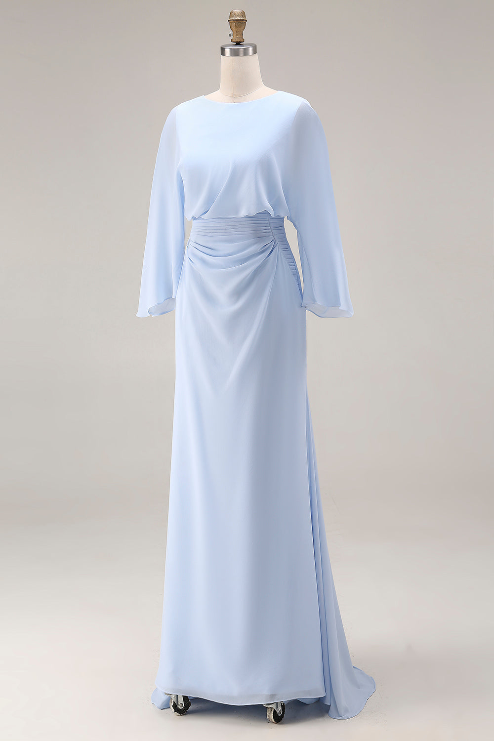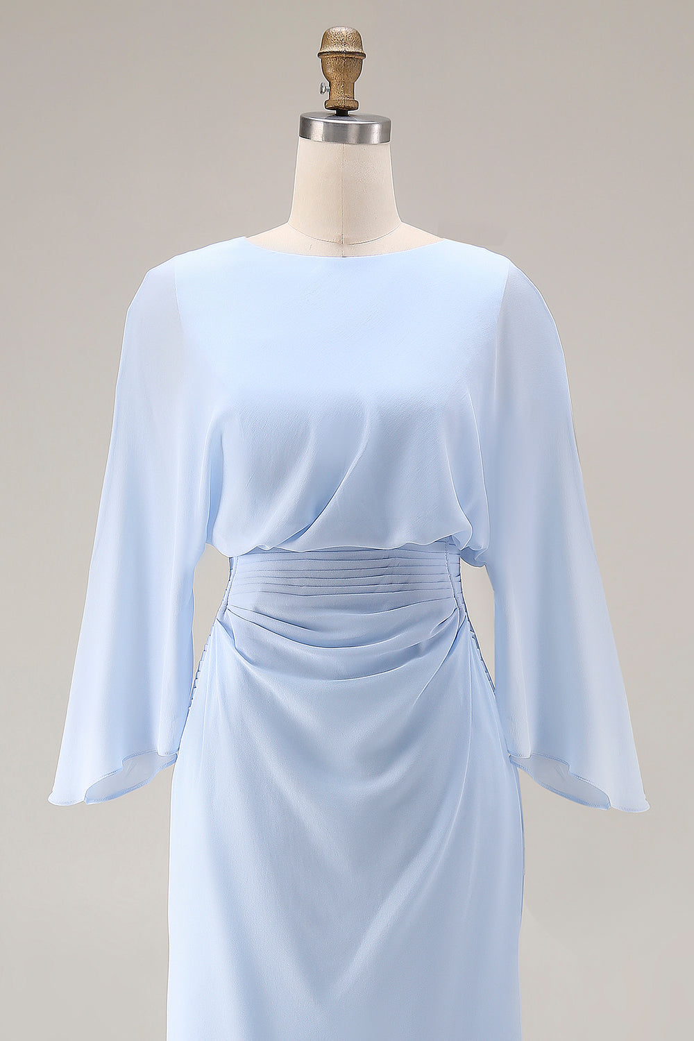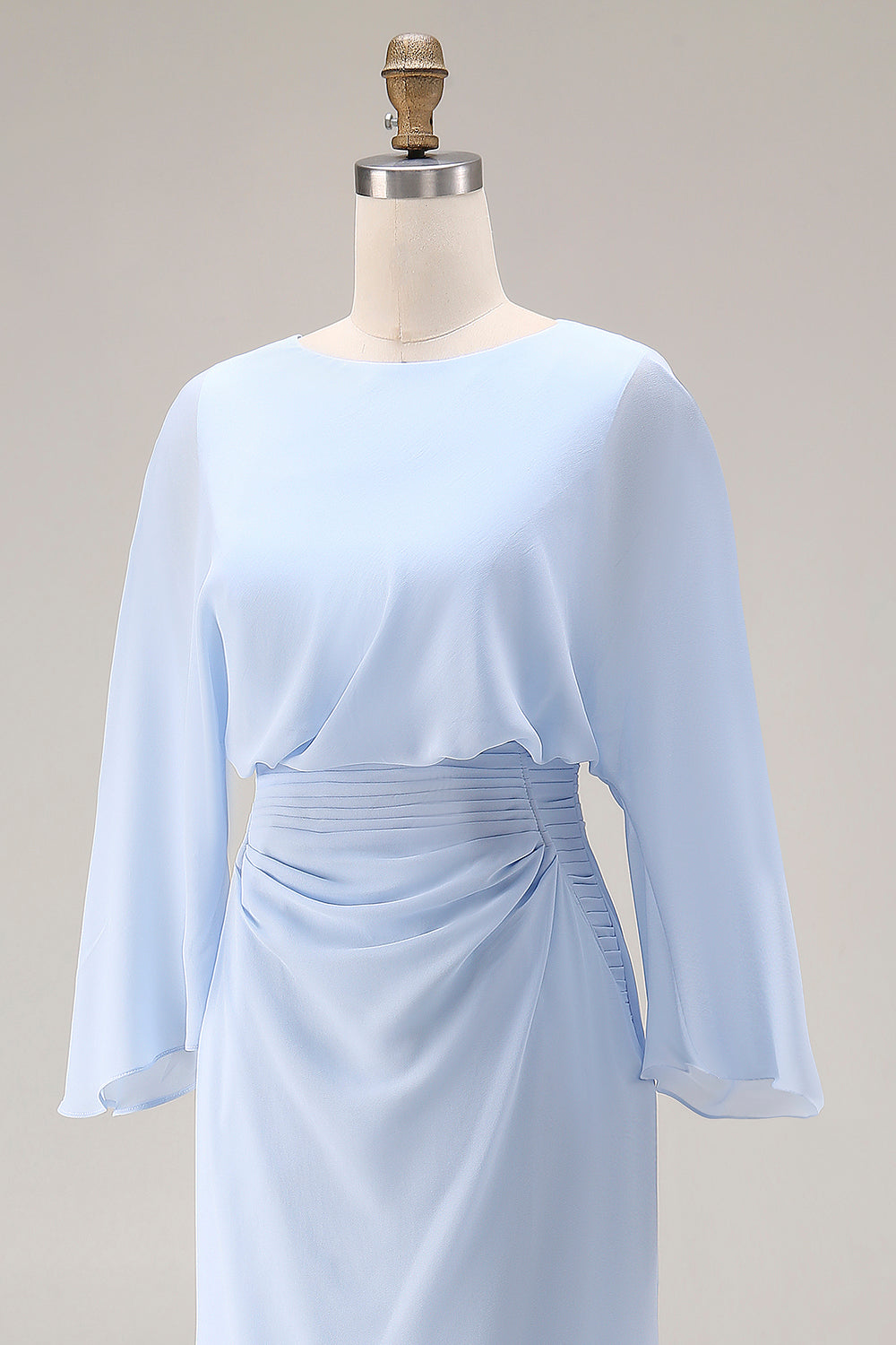 Light Blue Chiffon Sheath Long Mother of the Bride Dress with 3/4 Sleeves