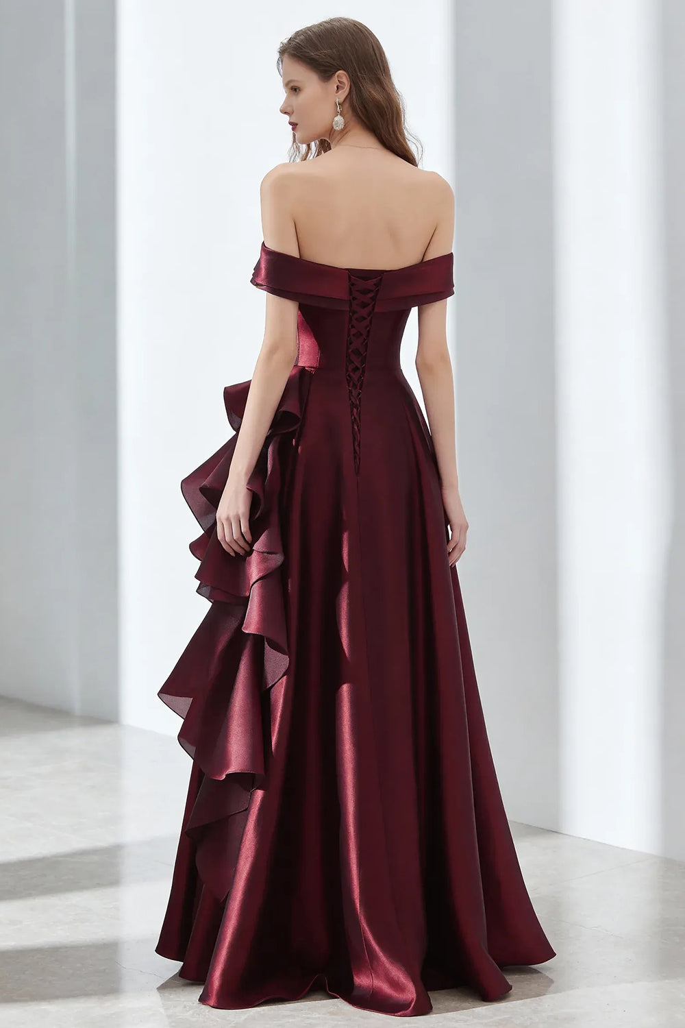 Off the Shoulder Burgundy A Line Satin Formal Dress with Ruffles