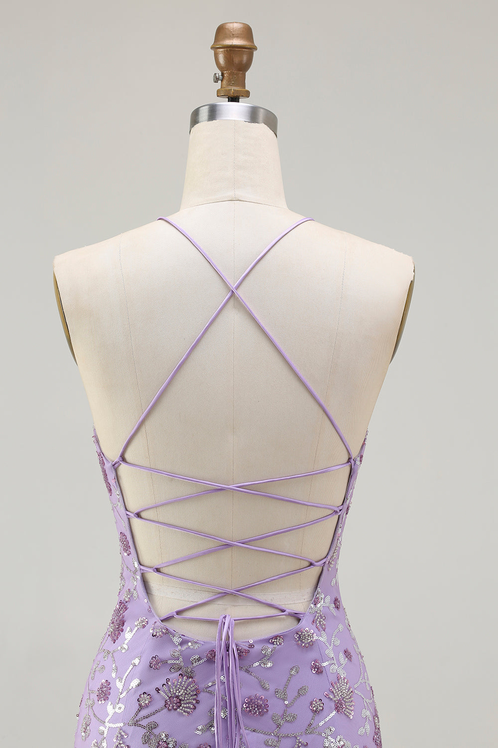 Purple Mermaid Beaded Lace Up Back Sequins Long Prom Dress with Slit