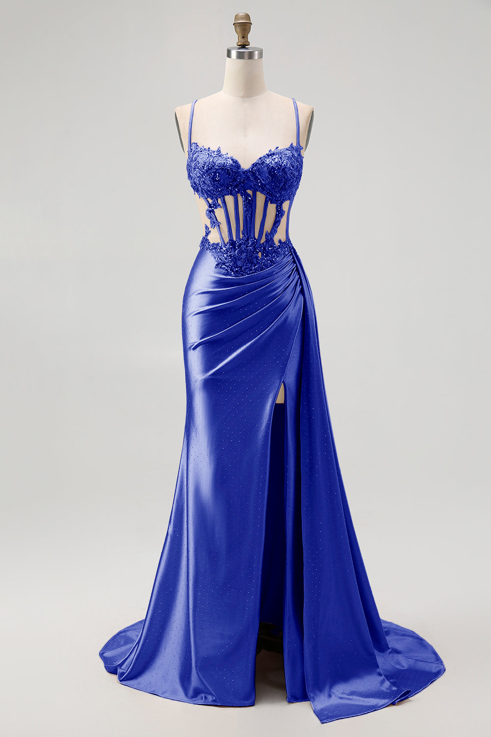 Champagne Mermaid Corset Streamer Beaded Ruched Long Prom Dress with Slit