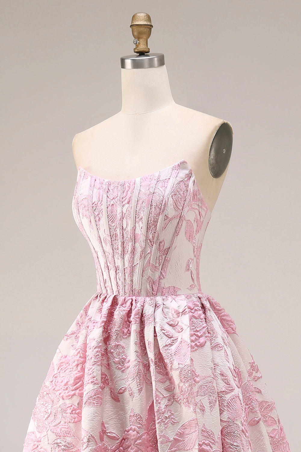 Ivory Pink Floral A Line Strapless Corset Long Prom Dress