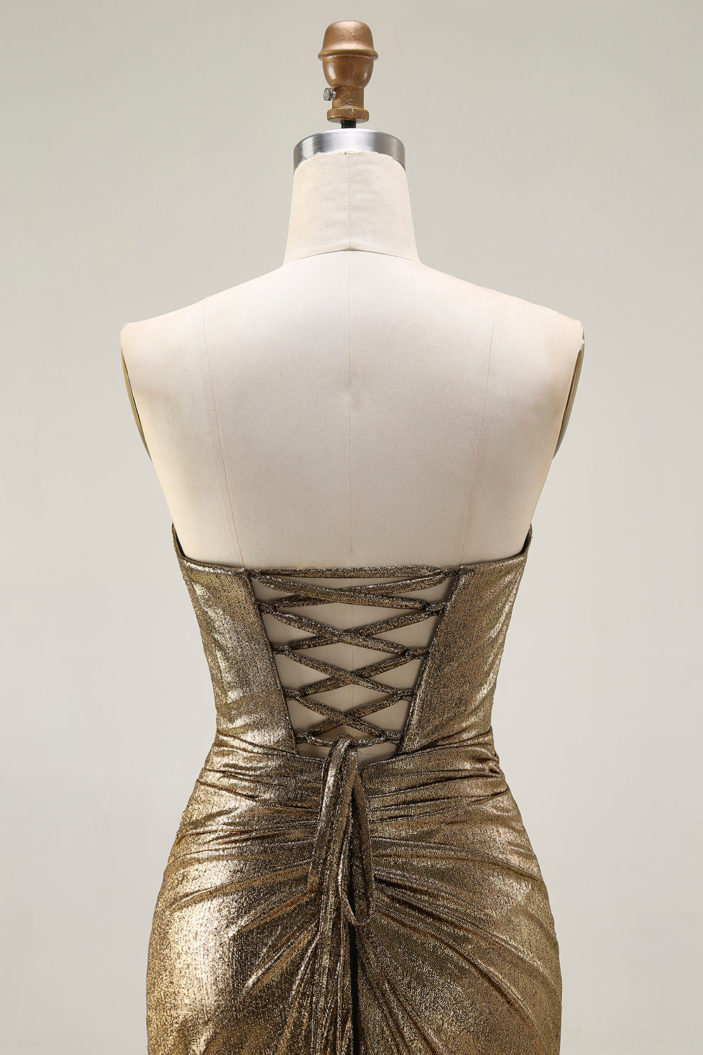 Metallic Fuchsia Strapless Mermaid Cut Out Lace Up Back Long Prom Dress with Slit
