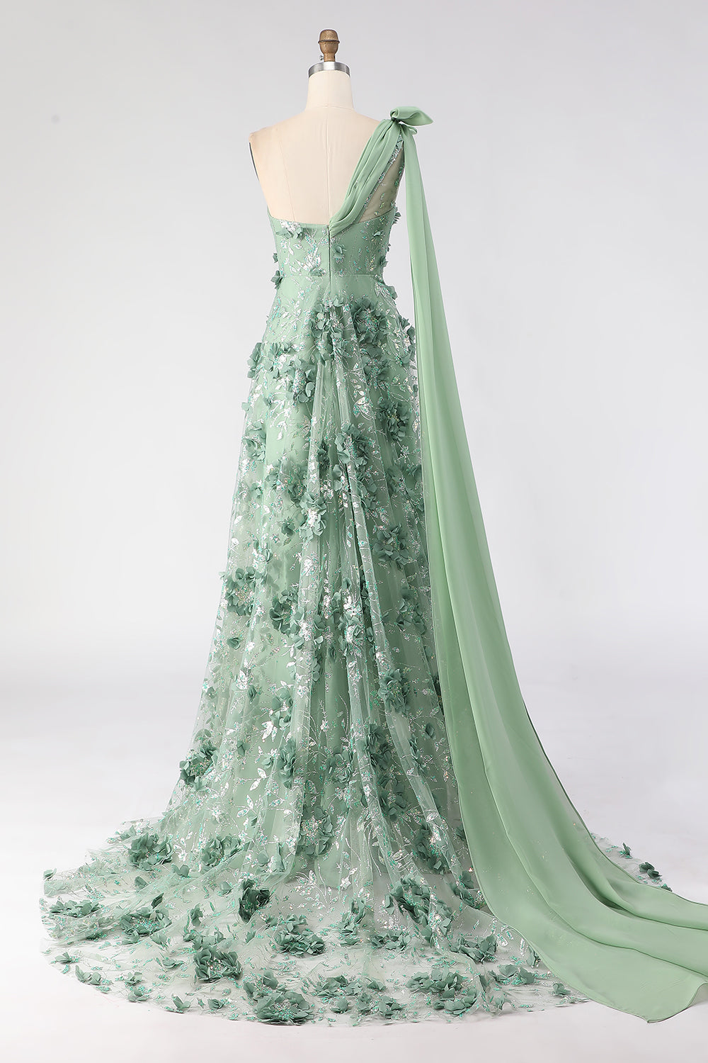 Eucalyptus A Line One Shoulder 3D Flowers Long Prom Dress with Slit
