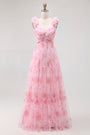 A-Line Off The Shoulder Chiffon Pink Floral Long Bridesmaid Dress with Ruffles