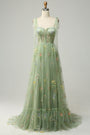 Green A-Line Square Neck Long Party Dress with Embroidery