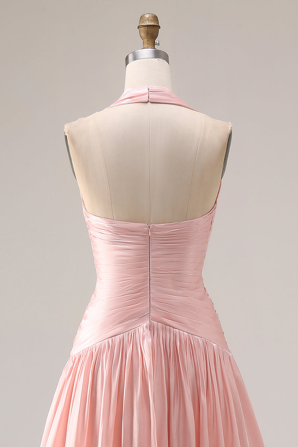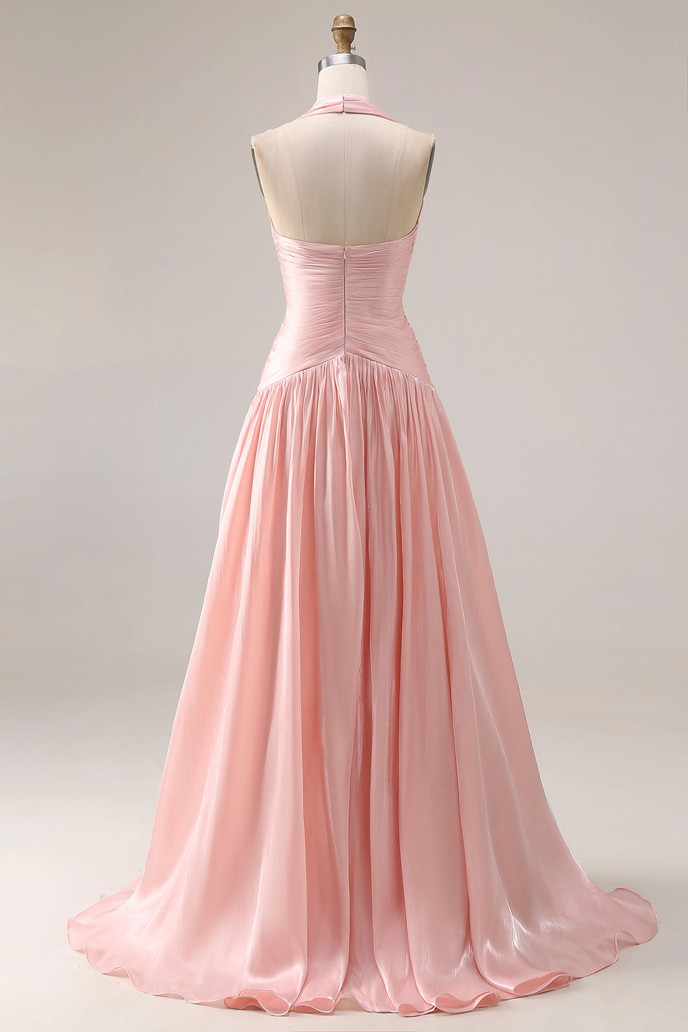 Halter Blush Pink A Line Pleated Long Prom Dress with Slit